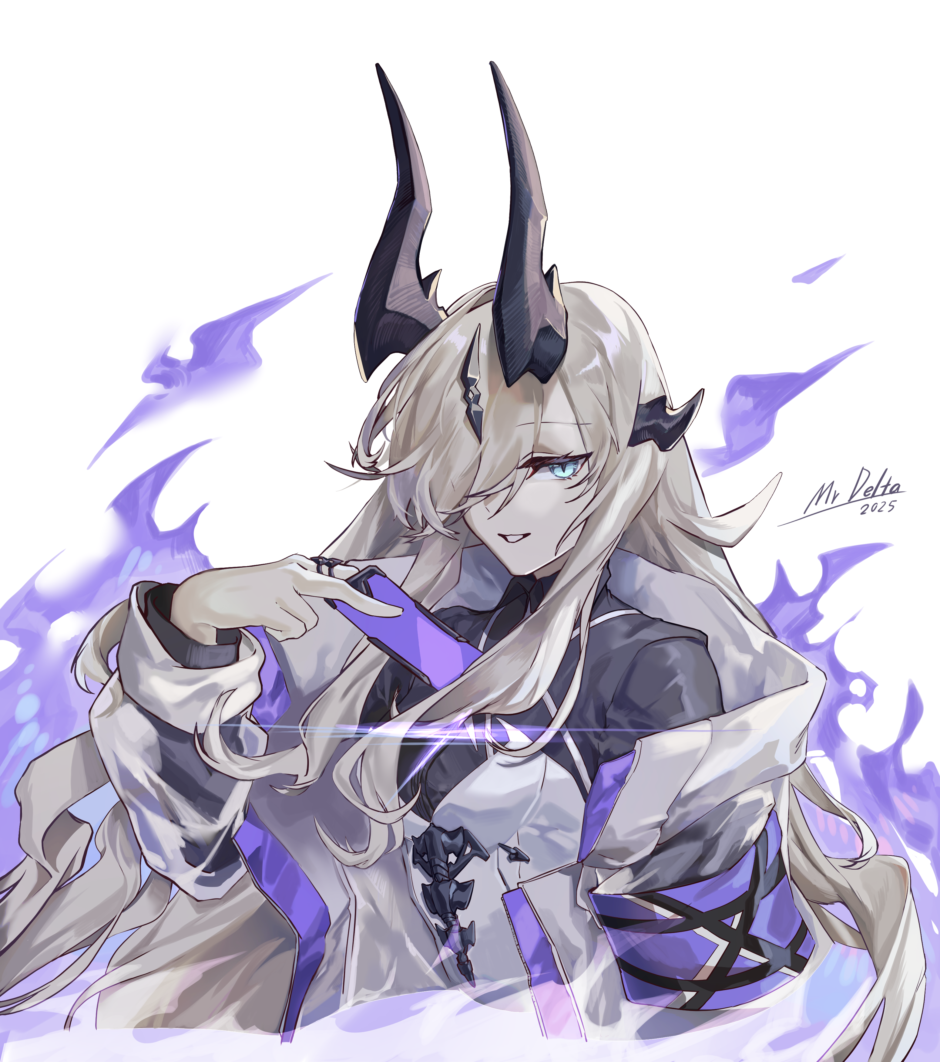 1girl absurdres arknights artist_name black_shirt blonde_hair blue_eyes breasts coat cropped_torso dated dragon_horns english_text fire hair_over_one_eye hand_up highres horns jacket long_hair long_sleeves looking_at_viewer mrdelta necrass_(arknights) off_shoulder one_eye_covered open_clothes open_jacket parted_lips purple_fire shirt simple_background smile solo sweater turtleneck upper_body white_background white_coat white_jacket