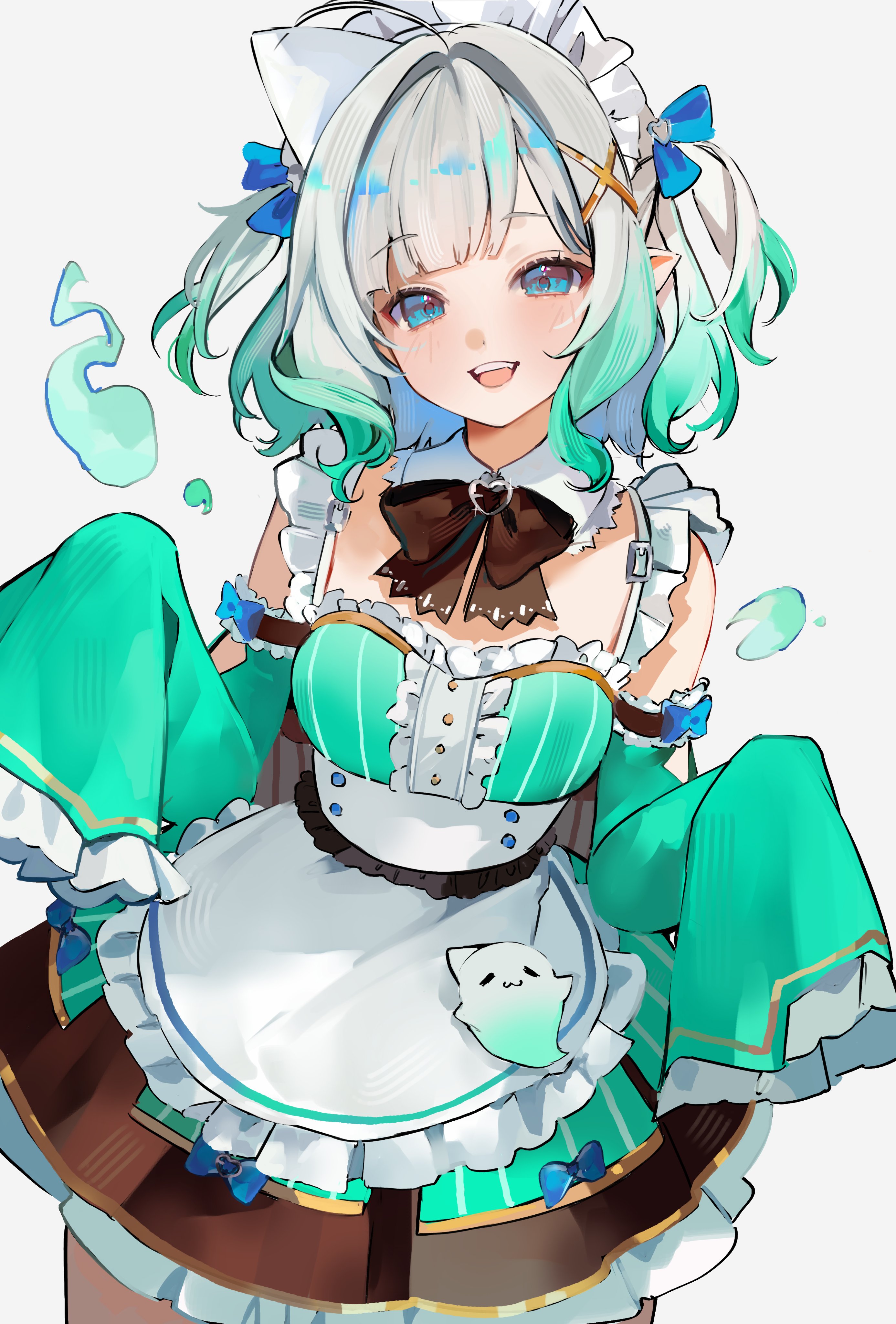 1girl absurdres ahoge apron aqua_dress aqua_hair aqua_sleeves blue_bow blue_eyes blush bow bowtie brown_bow brown_bowtie center_frills commentary cowboy_shot detached_collar detached_sleeves dress frilled_apron frilled_sleeves frills gradient_hair green_dress green_sleeves grey_hair hair_ornament highres indie_virtual_youtuber katsubaoo looking_at_viewer maid maid_headdress medium_hair mint_fantome mint_fantome_(minto_2.0) multicolored_hair open_mouth pointy_ears simple_background sleeveless sleeveless_dress sleeves_past_fingers sleeves_past_wrists smile solo standing untranslatable_commentary triangular_headpiece two-tone_hair two_side_up virtual_youtuber waist_apron white_apron white_background wisps_(mint_fantome) x_hair_ornament
