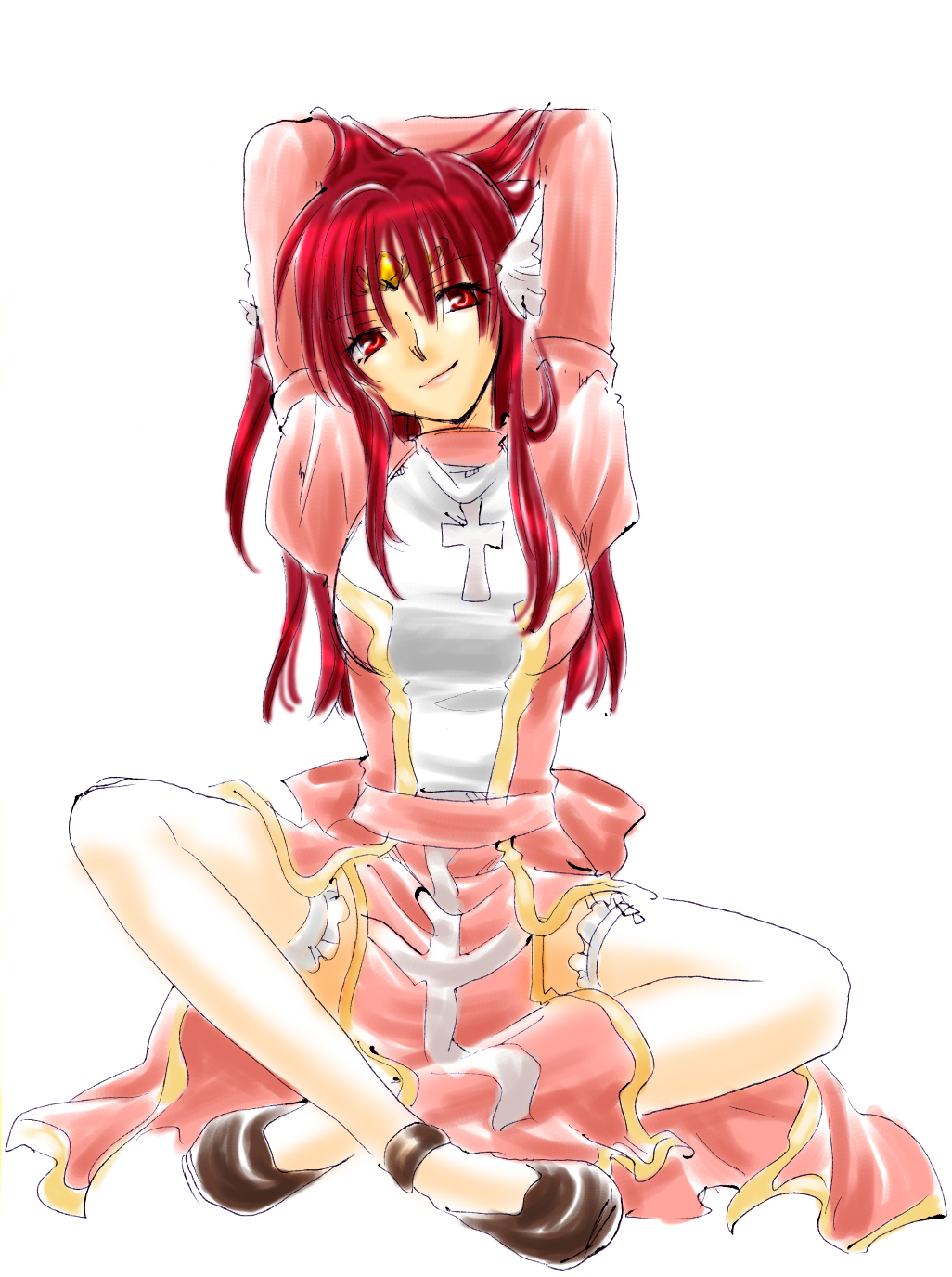 1girl arms_behind_head back_bow bow breasts brown_shoes closed_mouth commentary_request cross dress feathered_wings frilled_thighhighs frills full_body garter_straps head_tilt head_wings high_priest_(ragnarok_online) highres juliet_sleeves long_hair long_sleeves looking_at_viewer medium_breasts pink_bow pink_dress pink_sash puffy_sleeves ragnarok_online red_eyes red_hair sash shoes simple_background smile solo thighhighs two-tone_dress white_background white_dress white_thighhighs white_wings wings yuki_minaduki