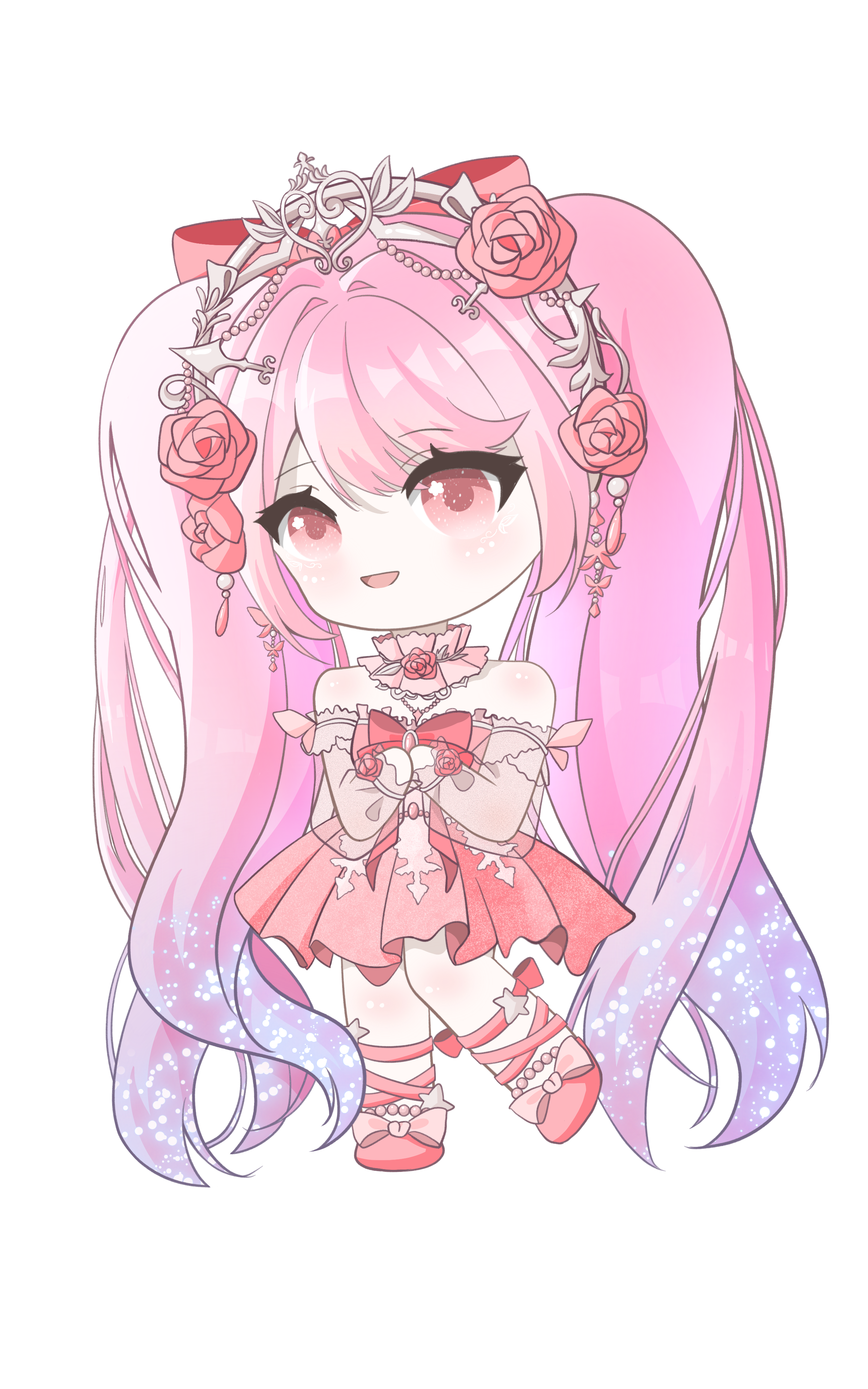 1girl absurdres bare_shoulders bow bow_legwear bowtie brooch chibi collar detached_collar detached_sleeves dress eyelashes flower footwear_bow frilled_collar frills gradient_hair hair_bow hair_flower hair_intakes hair_ornament hands_on_own_chest happy highres infinity_nikki jewelry leg_ribbon light_blush long_hair long_sleeves looking_ahead multicolored_hair neck_flower nikki_(series) open_mouth own_hands_together pink_bow pink_bowtie pink_collar pink_dress pink_eyes pink_flower pink_hair pink_ribbon pink_rose pink_shoes pink_sleeves pleated_dress puffy_long_sleeves puffy_sleeves purple_hair red_bow ribbon rose see-through_clothes see-through_sleeves shoes short_dress simple_background sleeve_bow smile solo standing star_(symbol) star_in_eye strapless strapless_dress swept_bangs symbol_in_eye tiara very_long_hair wavy_hair white_background white_tiara zhizhizhizhizhizong