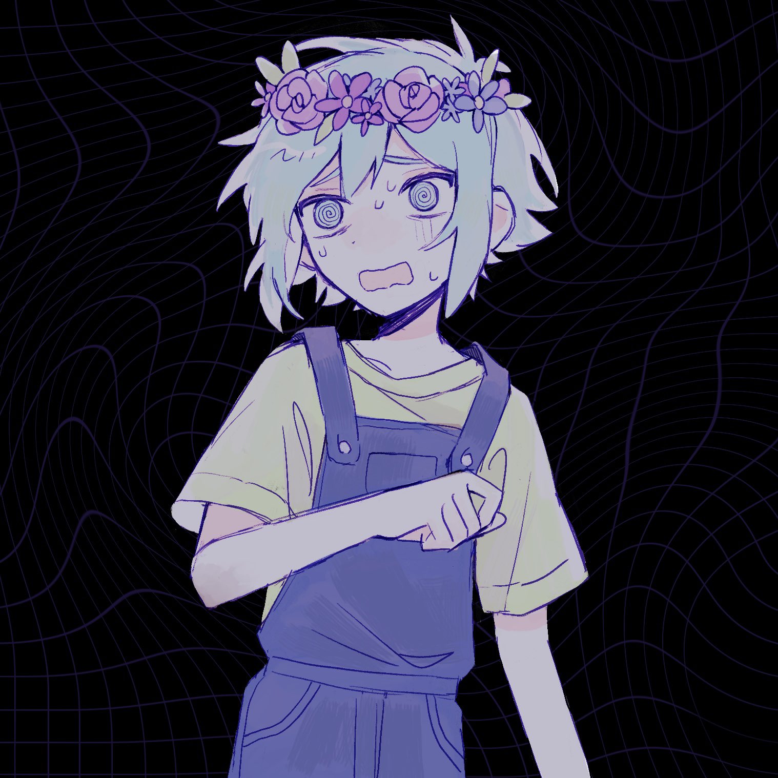 1boy @_@ basil_(headspace)_(omori) basil_(omori) blue_overalls commentary flower gm70t green_eyes green_hair green_shirt hashtag-only_commentary head_wreath highres male_focus omori open_mouth overalls shirt short_sleeves solo sweat t-shirt upper_body