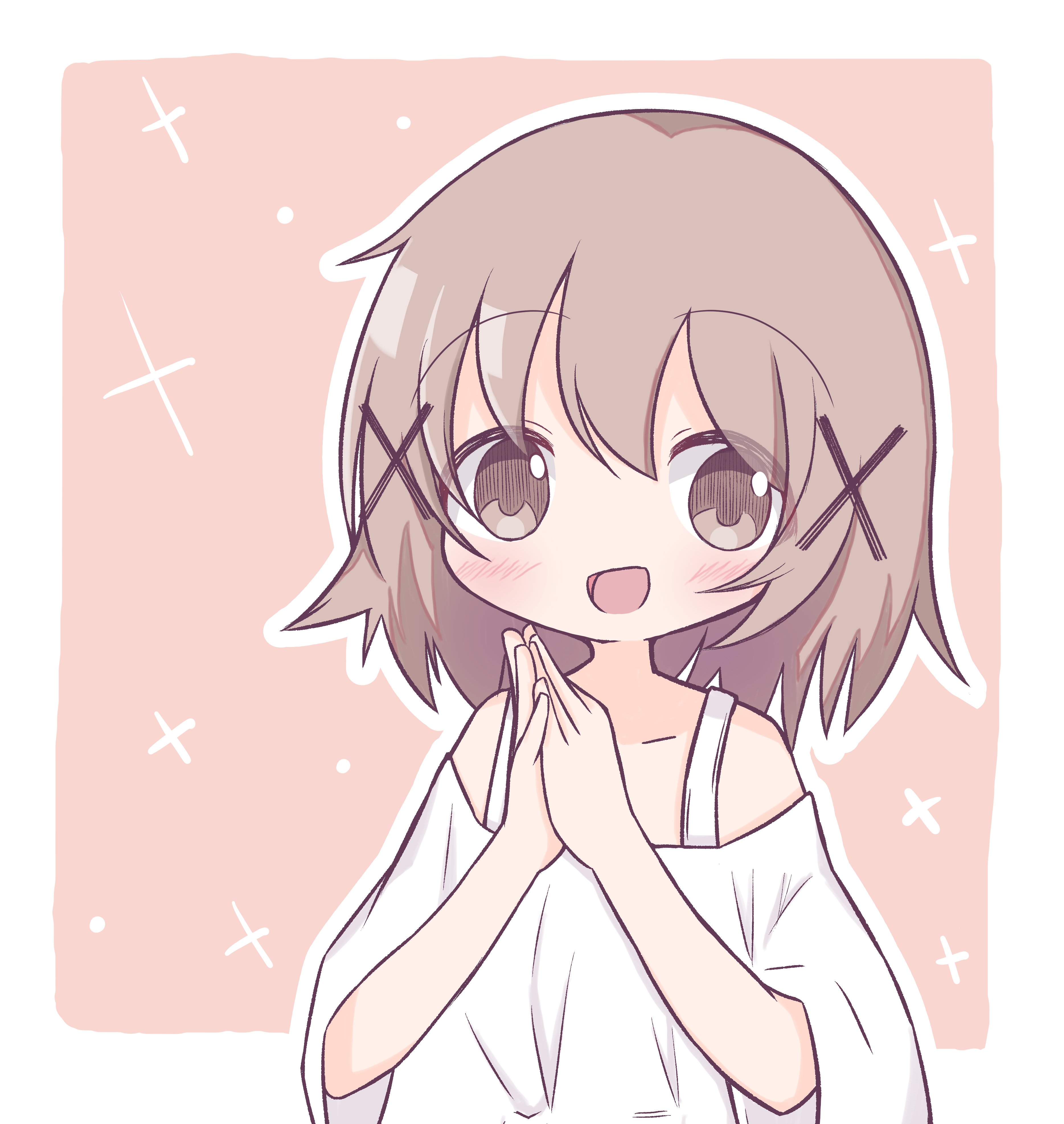 1girl absurdres blush brown_eyes brown_hair collarbone feet_out_of_frame female_focus hair_between_eyes hair_ornament hidamari_sketch highres kurasesu looking_at_viewer no_nose open_mouth solo standing x_hair_ornament yuno_(hidamari_sketch)