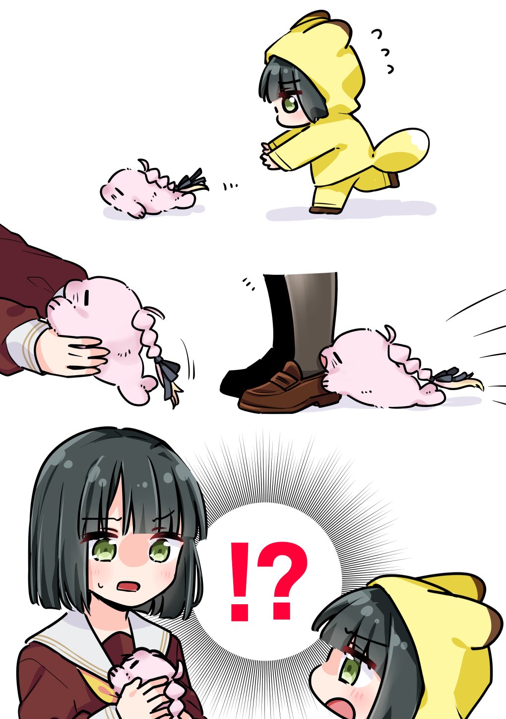 !? 2girls aged_down ahoge animal animal_ears animal_hood animalization anyoji_hime anyoji_hime_(seal) black_hair black_pantyhose black_ribbon blunt_bangs blunt_ends blush bob_cut brown_dress brown_shoes closed_eyes commentary dress dual_persona eye_contact fox_ears fox_hood fox_tail green_eyes hair_ribbon hasu_no_sora_school_uniform highres holding holding_animal holiday_holiday_(love_live!) holiday_holiday_(tenko)_(love_live!) hood link!_like!_love_live! loafers long_sleeves looking_at_another love_live! momose_ginko multi-tied_hair multiple_girls neckerchief official_alternate_costume open_mouth pants pantyhose ponytail ribbon sailor_collar sailor_dress school_uniform seal_(animal) shiro_(white_2530) shoes short_hair spoken_interrobang sweatdrop tail virtual_youtuber white_sailor_collar winter_uniform yellow_neckerchief yellow_pants