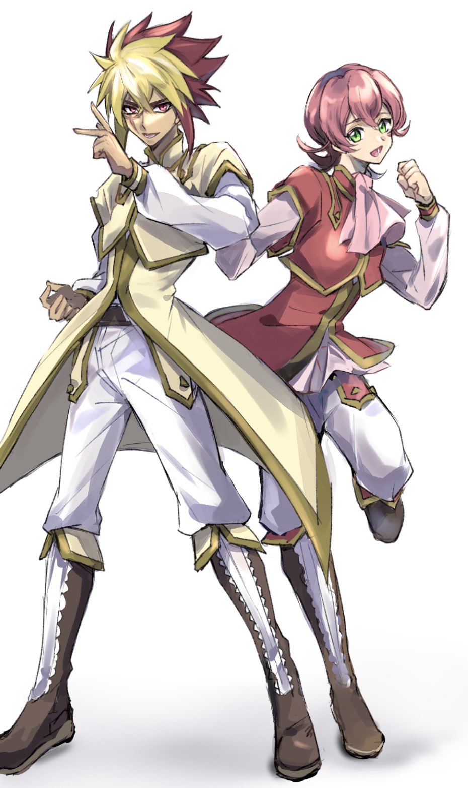 2boys blonde_hair brothers brown_hair coat full_body green_eyes highres iii_(yu-gi-oh!) iv_(yu-gi-oh!) jacket male_focus medium_hair multicolored_hair multiple_boys pants pink_hair red_jacket shikiruru siblings simple_background spiked_hair two-tone_hair white_background white_pants yellow_coat yu-gi-oh! yu-gi-oh!_zexal