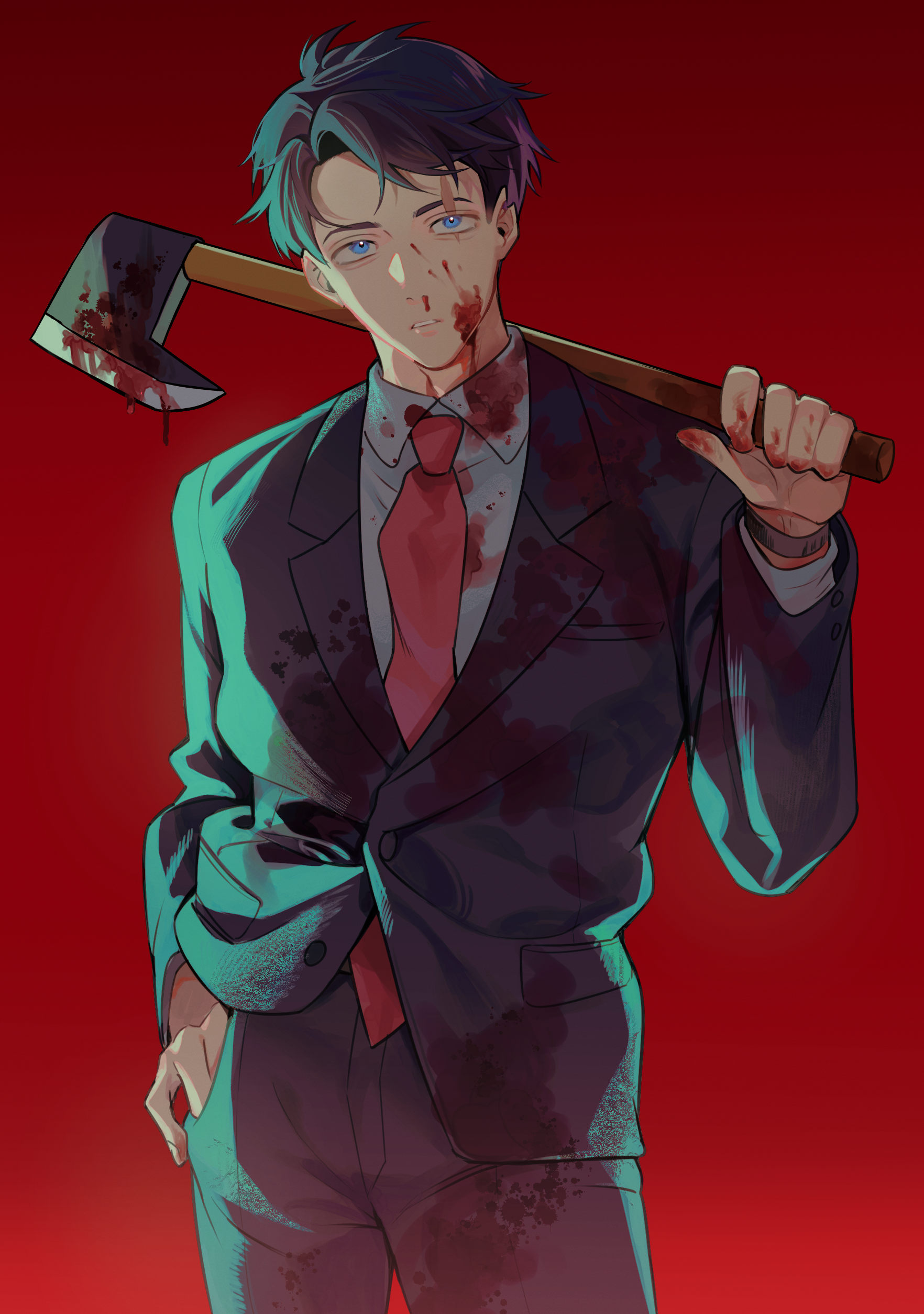 1boy absurdres axe black_hair black_suit blood blood_on_clothes blood_on_face blood_on_hands bloody_weapon blue_eyes chinese_commentary cowboy_shot formal_clothes gegege_no_kitarou gradient_background hand_in_pocket highres holding holding_axe holding_weapon jacket kitarou_tanjou:_gegege_no_nazo looking_at_viewer male_focus mizuki_(gegege_no_kitarou) necktie over_shoulder pants red_background red_necktie scar scar_on_face shirt short_hair simple_background solo standing suit wange80681 weapon weapon_over_shoulder