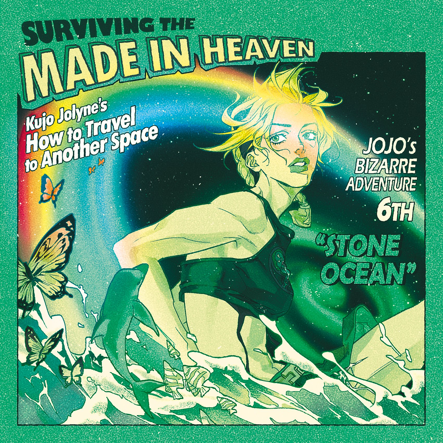 1girl artist_request black_hair blonde_hair breasts bug butterfly commentary_request copyright_name crop_top english_text fish green_eyes green_lips halterneck highres insect jojo_no_kimyou_na_bouken korean_commentary kuujou_jolyne miniskirt multicolored_hair parted_lips rainbow skirt small_breasts solo space stone_ocean two-tone_hair