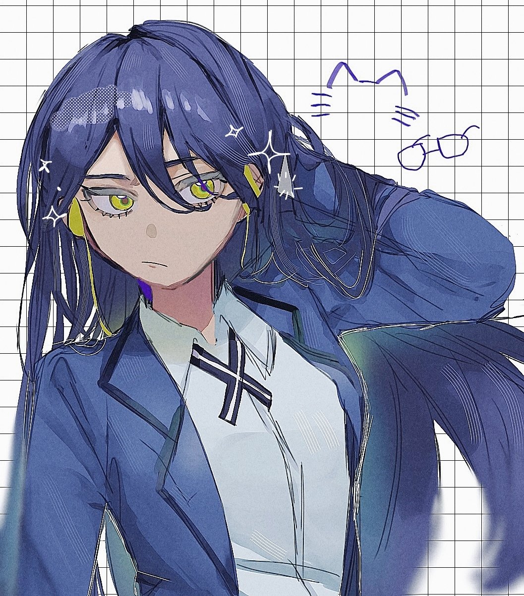 1girl blue_hair collared_shirt grid_background gundam gundam_gquuuuuux highres jacket long_hair nyaan_(gundam_gquuuuuux) sakihara_anko school_uniform shirt solo sparkle upper_body white_background white_shirt wireless_earphones yellow_eyes