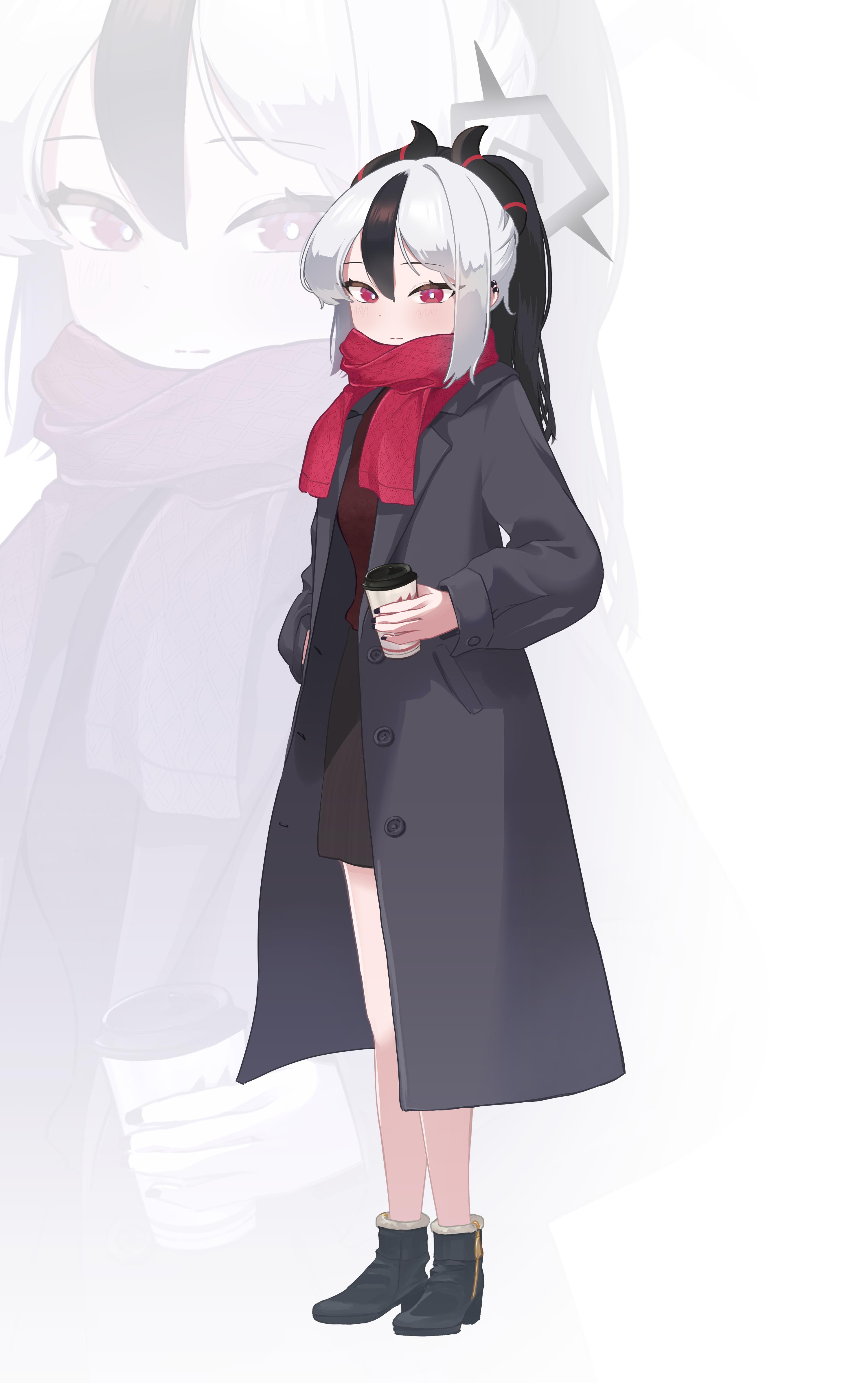 1girl absurdres black_boots black_hair black_horns black_skirt blue_archive boots breasts bright_pupils closed_mouth coat cup demon_horns disposable_cup earclip earrings grey_halo hair_between_eyes halo high_heel_boots high_heels highres holding holding_cup horns jewelry kayoko_(blue_archive) lifting_another's_clothes light_smile long_sleeves multicolored_hair multiple_earrings open_clothes open_coat ponytail red_eyes red_scarf red_shirt sa_kumo scarf shirt skirt small_breasts solo standing sud_(sudea) two-tone_hair white_hair white_pupils
