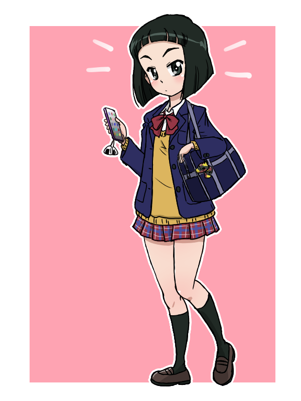 1girl alternate_costume animal_charm bag black_bag black_eyes black_hair blue_cardigan blush bob_cut boko_(girls_und_panzer) bowl_cut cardigan cellphone character_charm charm_(object) checkered_clothes checkered_skirt collared_shirt food girls_und_panzer gyaru holding holding_phone ios_(os) iphone looking_at_viewer miniskirt nishihara_yasoko official_alternate_costume onigiri phone pink_background pleated_skirt red_ribbon red_skirt ribbon satchel shirt short_hair simple_background skirt smartphone stuffed_animal stuffed_toy sweater takahashi_kurage teddy_bear yellow_sweater