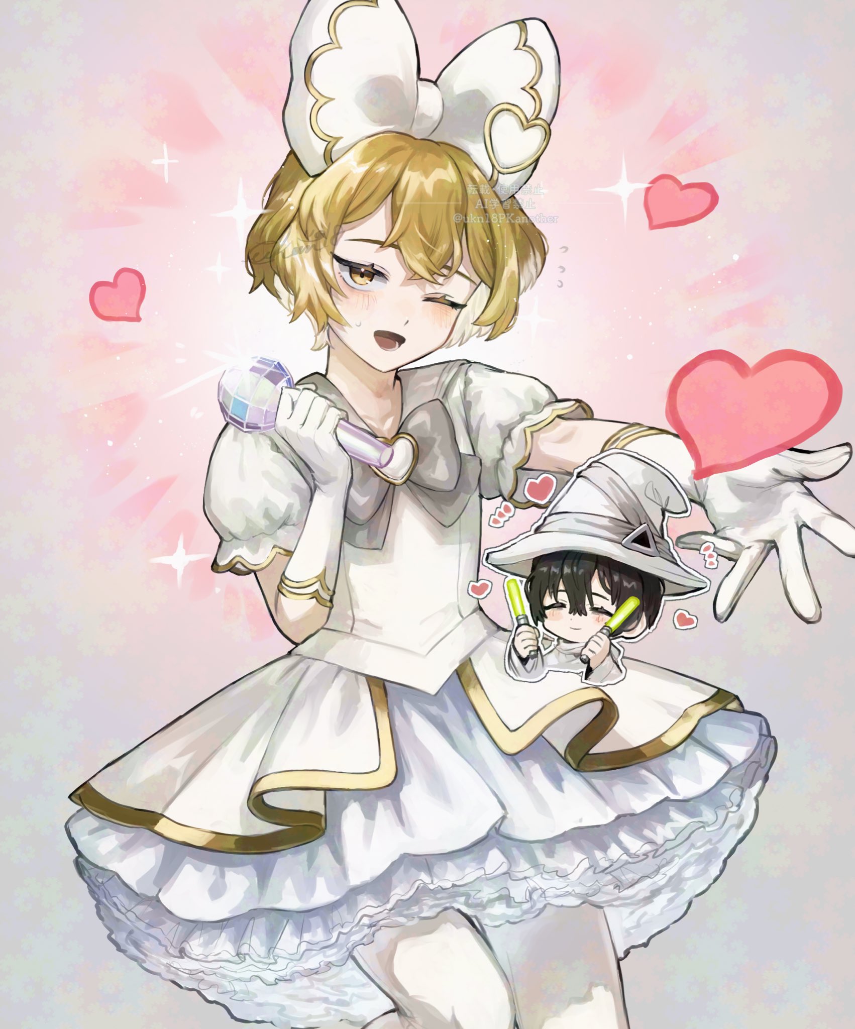 2boys alternate_costume black_hair blonde_hair blush bow closed_eyes dress gloves hair_bow hat heart highres idol limbus_company male_focus microphone multiple_boys one_eye_closed open_mouth project_moon short_hair sinclair_(project_moon) smile sweat upi_(ukn18pkanother) white_bow white_dress white_gloves witch_hat yi_sang_(project_moon)