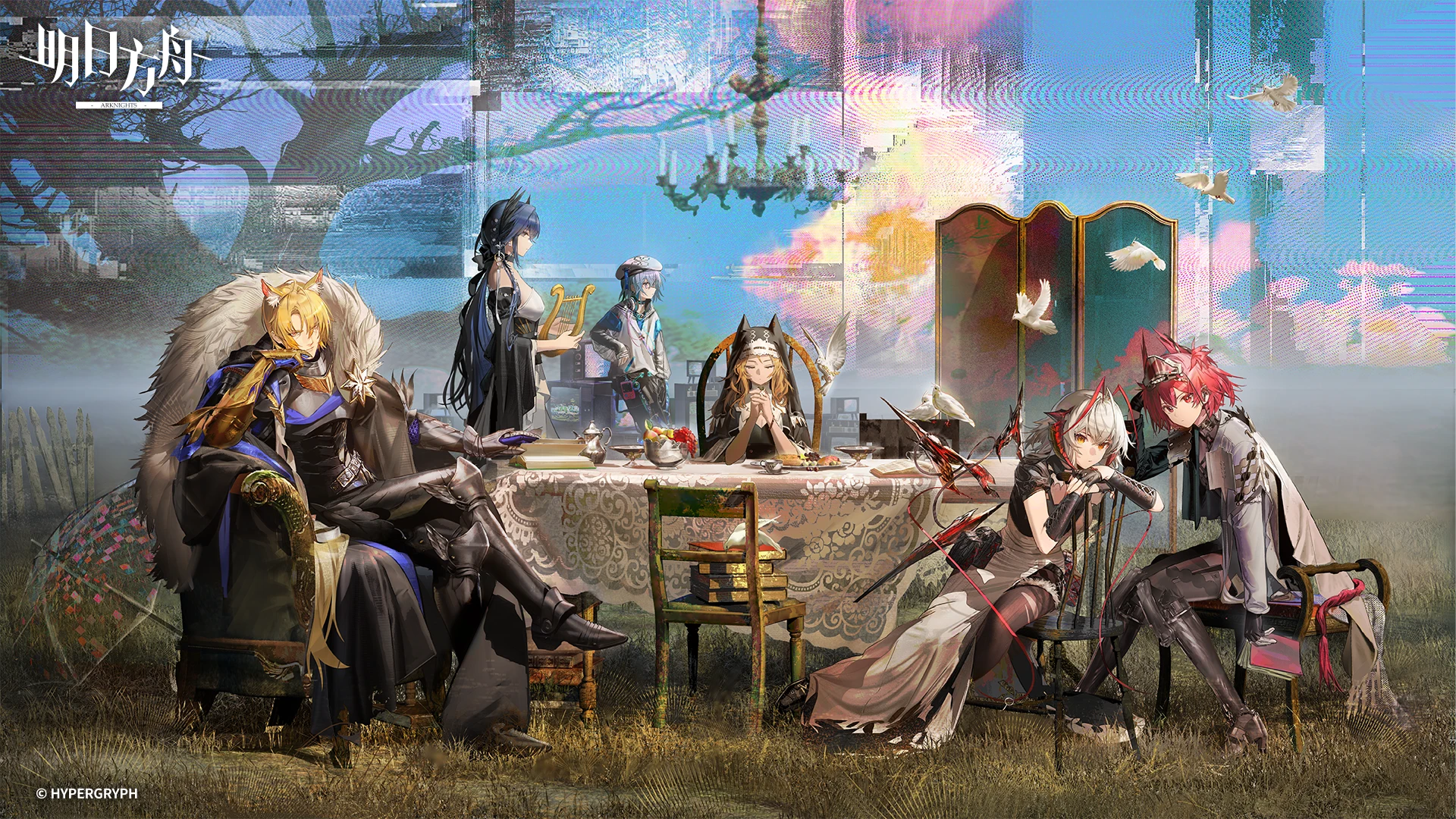 2boys 4girls ahoge animal_ears archetto_(arknights) archetto_(glory_of_the_devout)_(arknights) arknights bird blonde_hair cantabile_(arknights) cantabile_(bard_by_the_lake)_(arknights) chair fiammetta_(arknights) fiammetta_(judgment_day)_(arknights) food fruit grey_hair hands_up harp hat headgear highres instrument mizuki_(a_player_forever)_(arknights) mizuki_(arknights) mlynar_(arknights) mlynar_(roar_against_the_wild)_(arknights) multiple_boys multiple_girls nun official_art on_chair orange_eyes red_eyes red_hair screen sitting table tail umbrella w_(arknights) white_bird wings wis'adel_(arknights) wis'adel_(supernova)_(arknights)