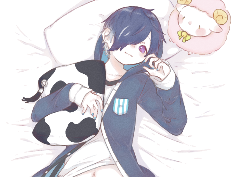 1boy animal_print bed_sheet bell belphegor_(obey_me!) blue_cardigan blue_hair blue_nails blush breast_pocket cardigan clothes_lift collarbone cow_print curled_horns from_above hair_over_one_eye holding holding_pillow hood hooded_cardigan horns light_smile long_sleeves looking_at_viewer lying male_focus mc_(obey_me!) midriff_peek multicolored_hair navel neck_bell neck_ribbon obey_me!:_one_master_to_rule_them_all! on_back pale_skin partially_unbuttoned pillow pocket purple_eyes raised_eyebrows ribbon sheep shironyan_nyan shirt_lift short_hair solo_focus streaked_hair striped_clothes tareme two-sided_fabric vertical-striped_clothes white_hair