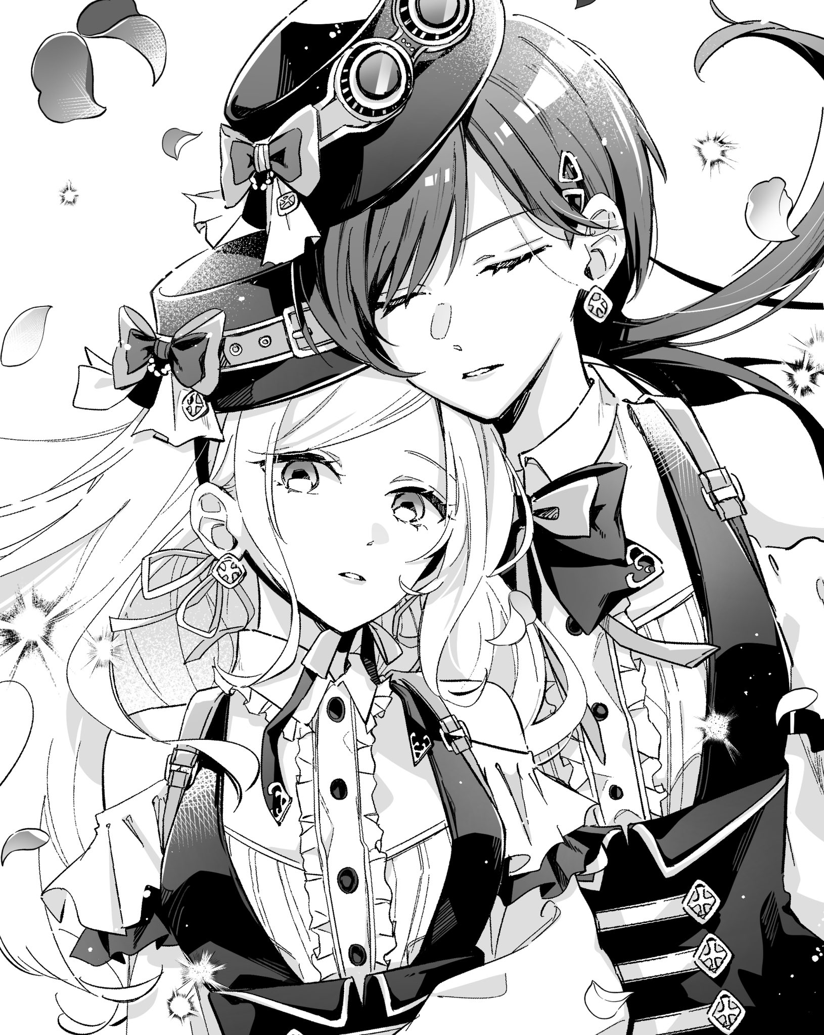 2girls bare_shoulders bow bowtie breasts center_frills ceras_yanagida_lilienfeld closed_eyes clothing_cutout collared_shirt commentary edel_note facing_viewer falling_petals frilled_shirt frilled_shirt_collar frills goggles goggles_on_headwear greyscale hair_ribbon hat high-waist_skirt highres katsuragi_izumi link!_like!_love_live! long_hair looking_at_viewer love_live! medium_breasts monochrome multiple_girls official_alternate_costume parted_bangs parted_lips petals retrofuture_(love_live!) ribbon saito_shiorii shirt shoulder_cutout sidelocks simple_background skirt untranslatable_commentary tilted_headwear underbust upper_body virtual_youtuber wavy_hair white_background wolf_cut