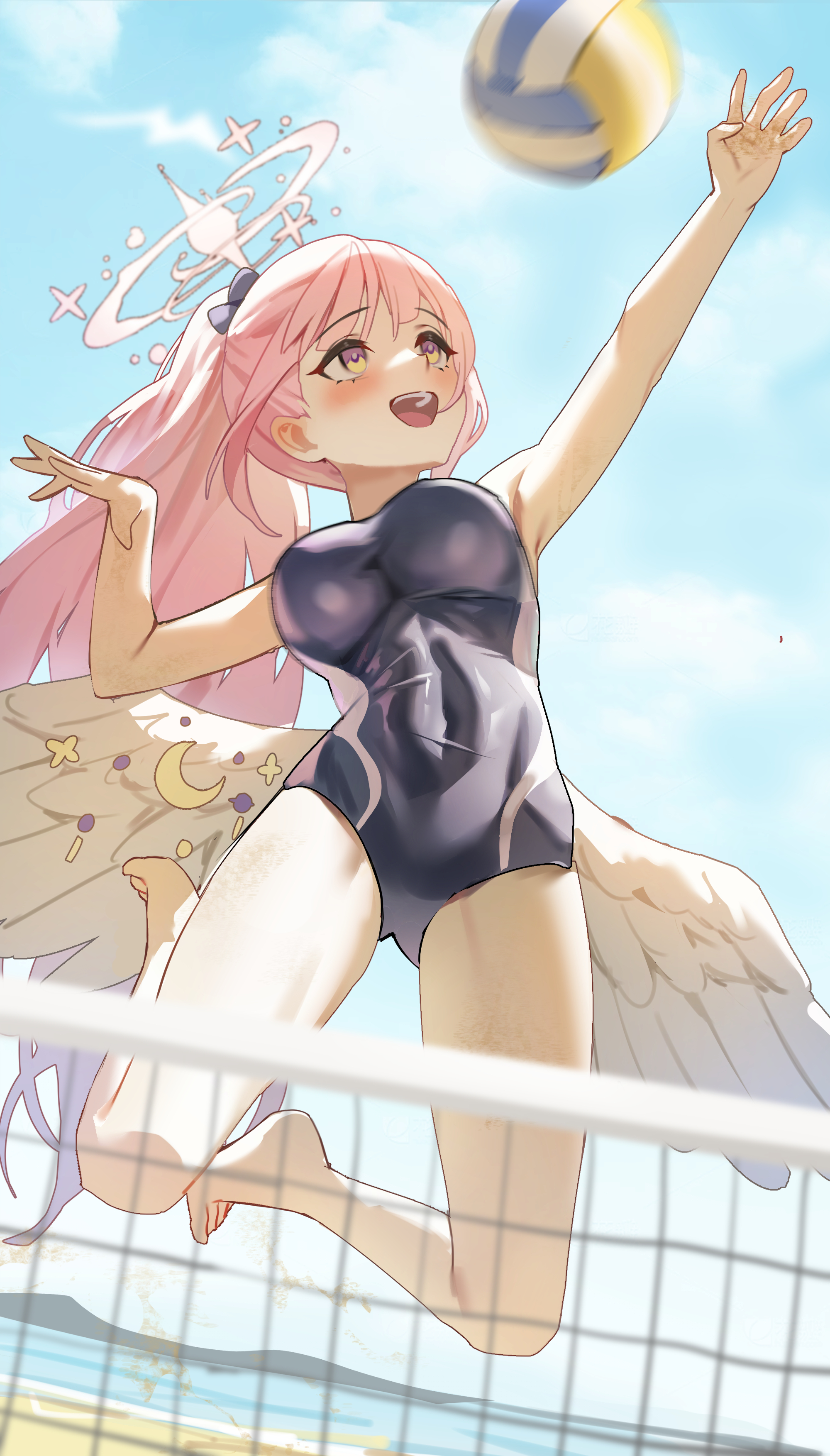 1girl absurdres ball barefoot beach blue_archive covered_navel halo highres jumping long_hair looking_up mika_(blue_archive) open_mouth pink_hair ponytail qianyuu_(senba) school_swimsuit smile solo_focus swimsuit volleyball volleyball_(object) white_halo white_wings wings