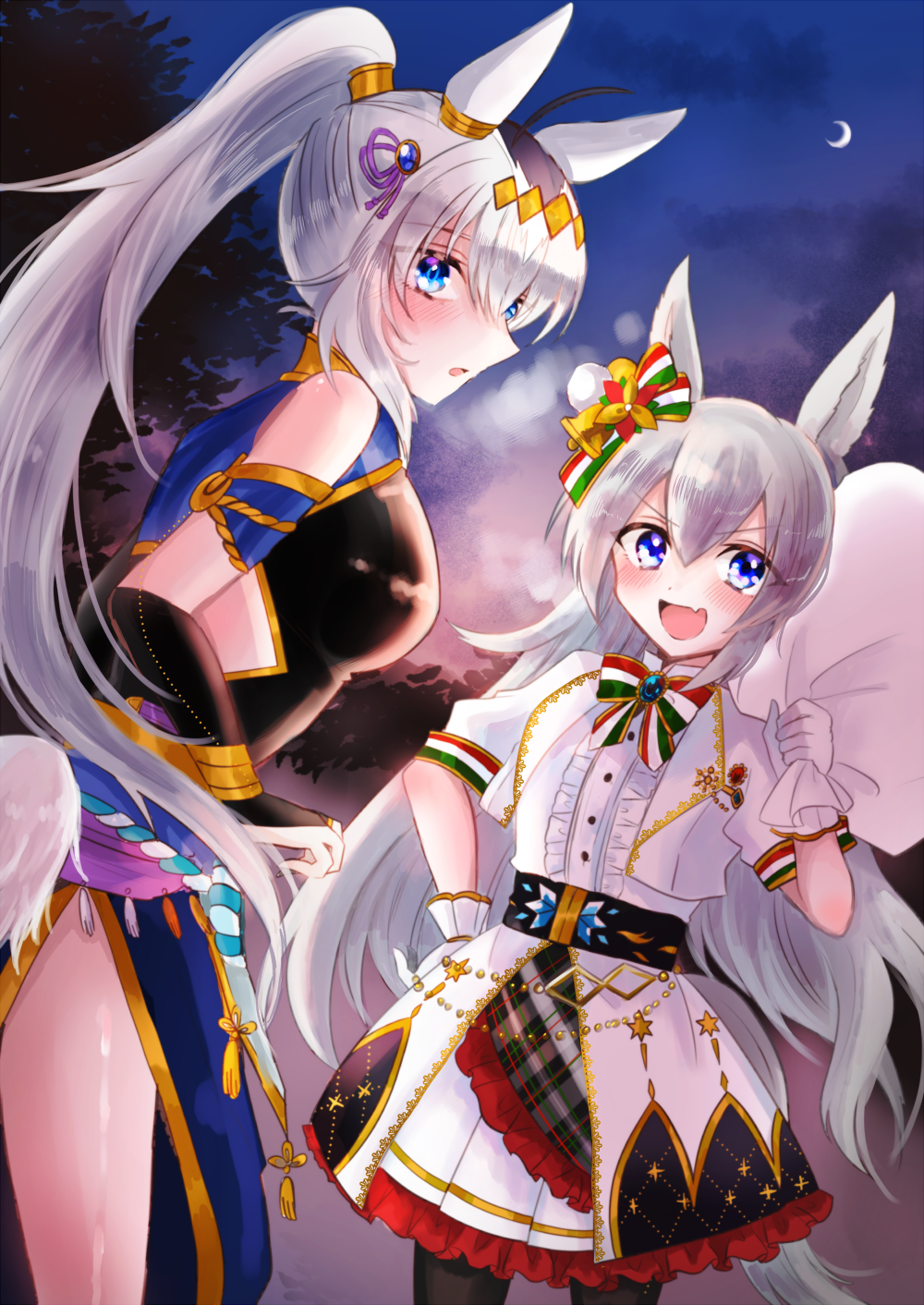2girls animal_ears black_pantyhose black_shirt blue_eyes blue_pants blush bow bowtie bracelet brooch center_frills christmas clothing_cutout commentary_request cosplay costume_switch crescent_moon dress dutch_angle ear_ornament fang frilled_dress frills grey_hair hair_ornament hair_tie hand_on_own_hip high_ponytail highres holding holding_sack horse_ears horse_girl horse_tail jacket jewelry leaning_forward long_hair looking_at_viewer looking_back mimoe moon multiple_girls night oguri_cap_(ashen_miracle)_(umamusume) oguri_cap_(umamusume) open_mouth outdoors over_shoulder pants pantyhose partial_commentary ponytail sack shirt short_sleeves side_cutout side_slit skin_fang smile standing tail tamamo_cross_(fierce_thunder_god)_(umamusume) tamamo_cross_(umamusume) umamusume white_dress white_jacket