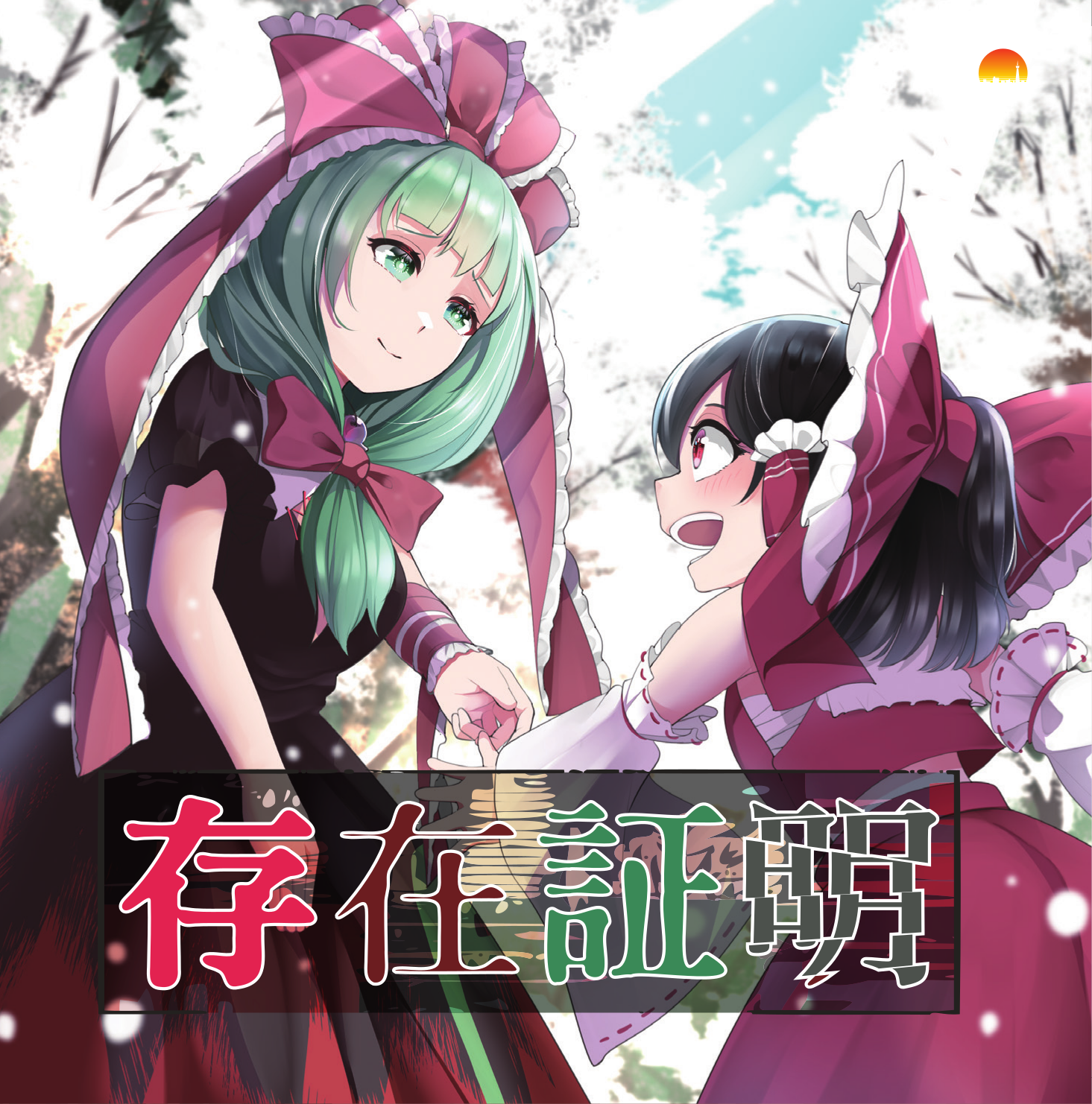 2girls aged_down akaneirotown album_cover album_name arm_ribbon black_hair blush bow breasts child closed_mouth commentary_request cover detached_sleeves dress eye_contact frilled_bow frilled_hair_tubes frilled_ribbon frills front_ponytail green_eyes green_hair hair_bow hair_ribbon hair_tubes hakurei_reimu highres kagiyama_hina long_hair looking_at_another multiple_girls nodoguro_(phi-tan) open_mouth outdoors red_bow red_dress red_eyes red_ribbon red_skirt ribbon ribbon-trimmed_sleeves ribbon_trim short_sleeves skirt skirt_set smile touhou translation_request
