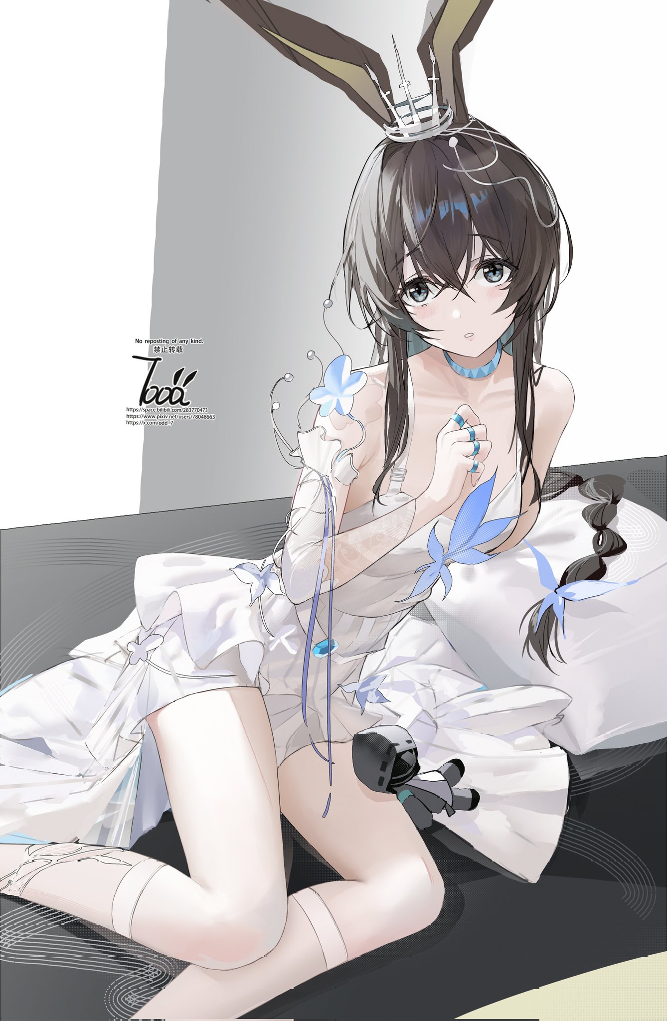 0dd amiya_(arknights) animal_ears arknights choker collarbone crown doll dress hair_between_eyes highres long_hair looking_at_viewer simple_background thighhighs watermark white_dress