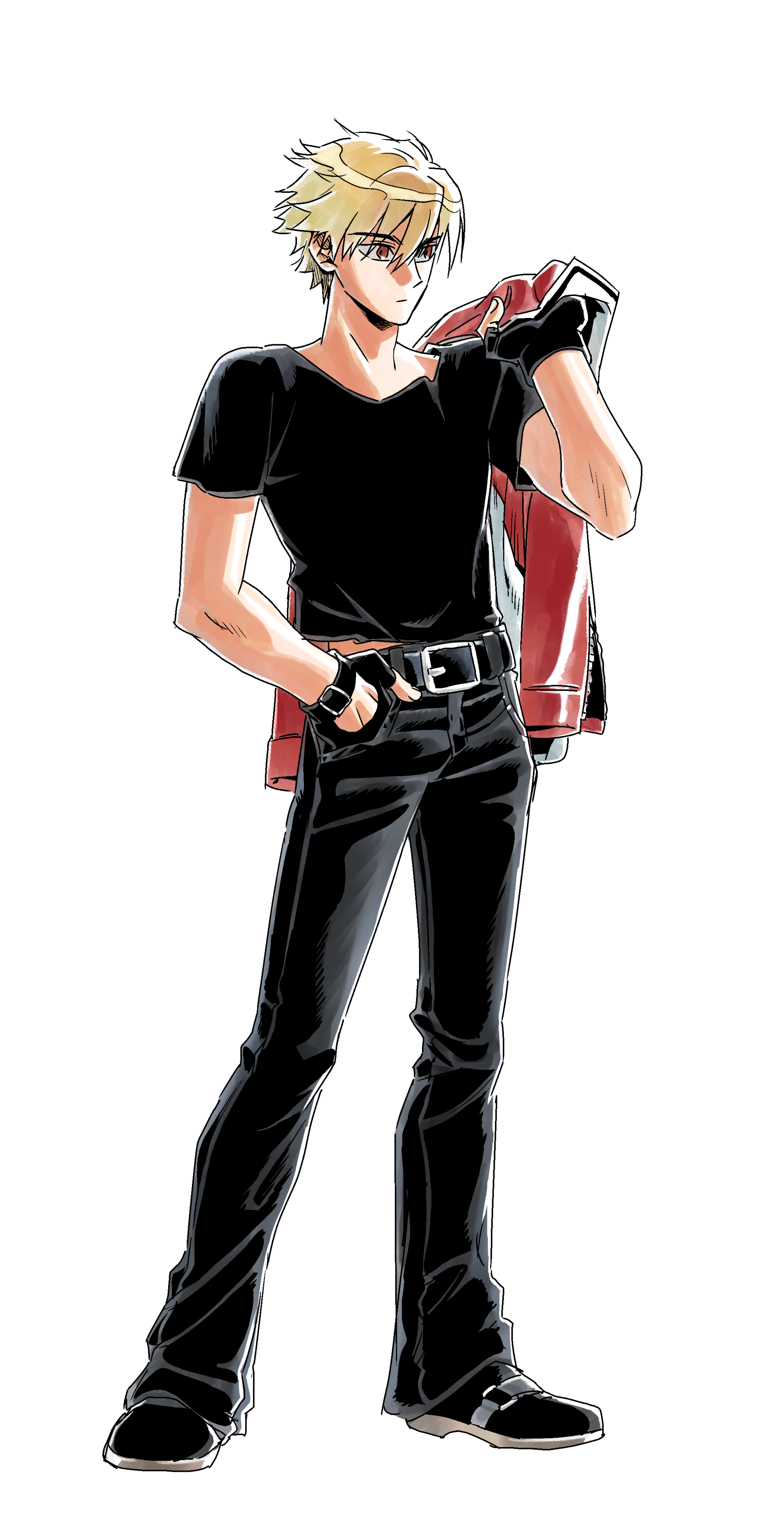 1boy absurdres alpha_transparency belt black_belt black_gloves black_pants black_shirt blonde_hair commentary_request fatal_fury fingerless_gloves full_body garou:_mark_of_the_wolves gloves hand_in_pocket highres holding holding_jacket holding_unworn_clothes jacket jacket_over_shoulder jeonjin_(mynamebazin) korean_commentary male_focus pants red_eyes rock_howard shirt solo transparent_background unworn_jacket