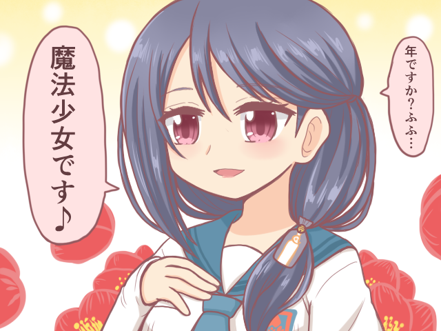 1girl bad_id bad_twitter_id blue_hair floral_background flower hair_ornament hair_over_shoulder long_hair looking_at_viewer magia_record:_mahou_shoujo_madoka_magica_gaiden mahou_shoujo_madoka_magica mahou_shoujo_suzune_magica mikoto_tsubaki open_mouth red_eyes red_flower reverse_(bluefencer) school_uniform serafuku smile solo speech_bubble upper_body