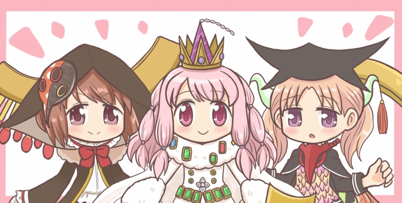 3girls :o adapted_costume bad_id bad_twitter_id black_cloak black_hat blush bow bowtie brown_hair chibi cloak closed_mouth cosplay crown dot_nose dress fur_trim gem hat hiiragi_nemu long_hair long_sleeves looking_at_viewer magia_record:_mahou_shoujo_madoka_magica_gaiden mahou_shoujo_madoka_magica multiple_girls pennen_nenemu pennen_nolde pink_eyes pink_hair purple_eyes red_bow red_bowtie reverse_(bluefencer) satomi_touka shitori_egumo_(madoka_magica) sidelocks smile tamaki_ui twintails witch_(madoka_magica)