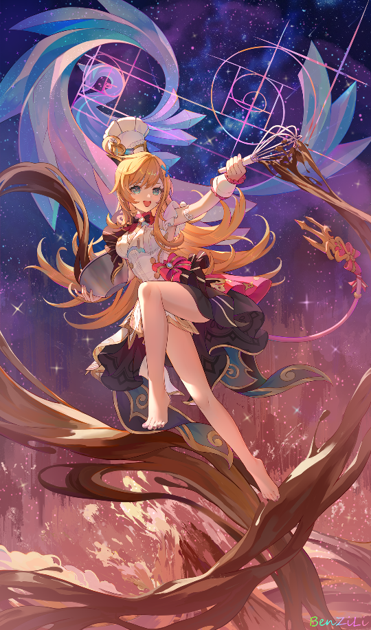 1girl ahoge barefoot benzi_li blonde_hair blue_eyes chef_hat escoffier_(genshin_impact) genshin_impact hair_ornament hat holding knife_hair_ornament long_hair smile solo tail white_hat wrist_cuffs