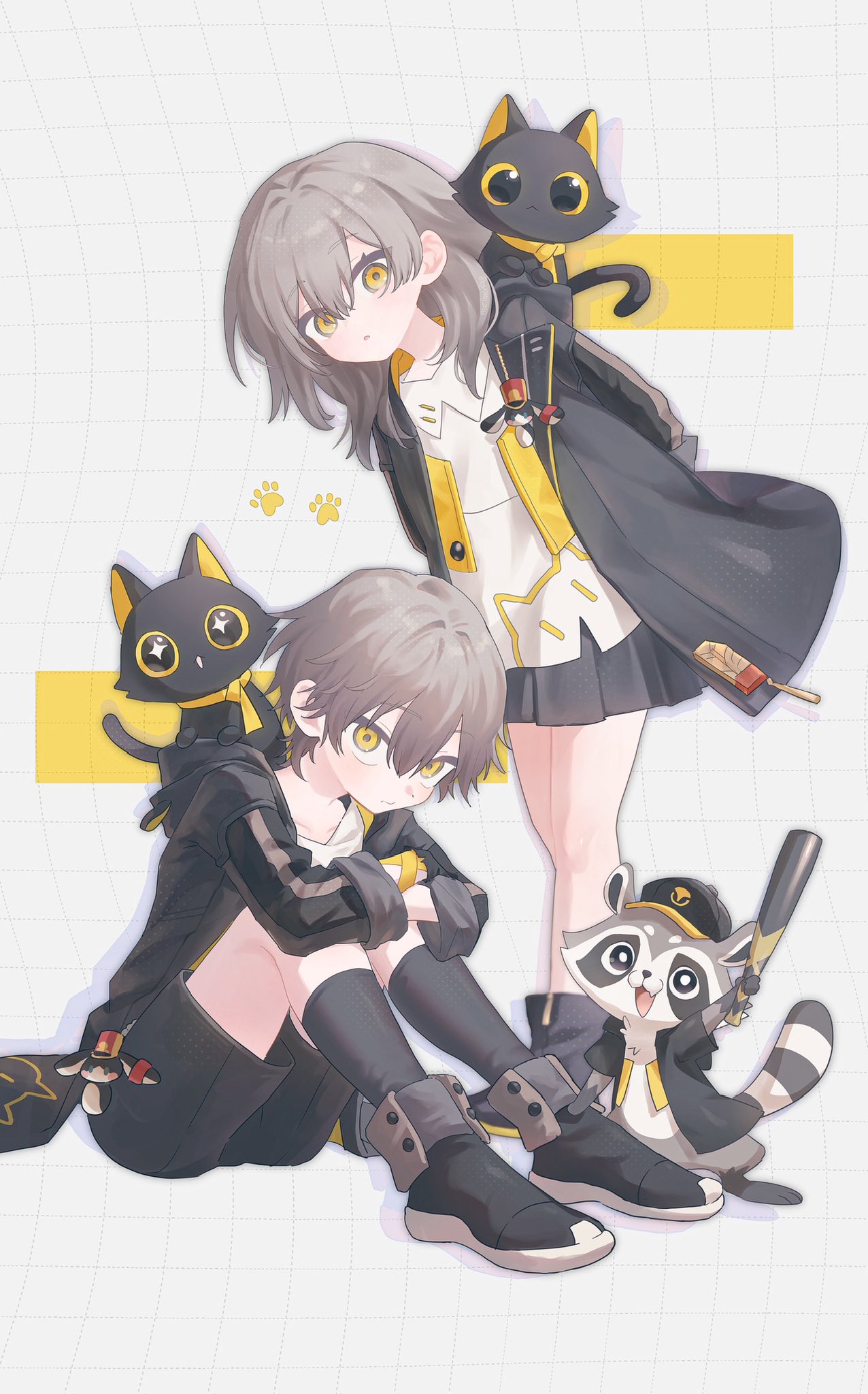 1boy 1girl aged_down baseball_bat black_jacket black_shoes black_shorts black_skirt black_socks caelus_(honkai:_star_rail) child closed_mouth commentary_request dual_persona grey_hair highres holding holding_baseball_bat honkai:_star_rail honkai_(series) jacket kneehighs knees_up medium_hair meimu428 open_clothes open_jacket parted_lips pleated_skirt raccoon shoes short_hair shorts skirt socks standing stelle_(honkai:_star_rail) trailblazer_(honkai:_star_rail) trailblazer_(trash_cake)_(honkai:_star_rail) yellow_eyes