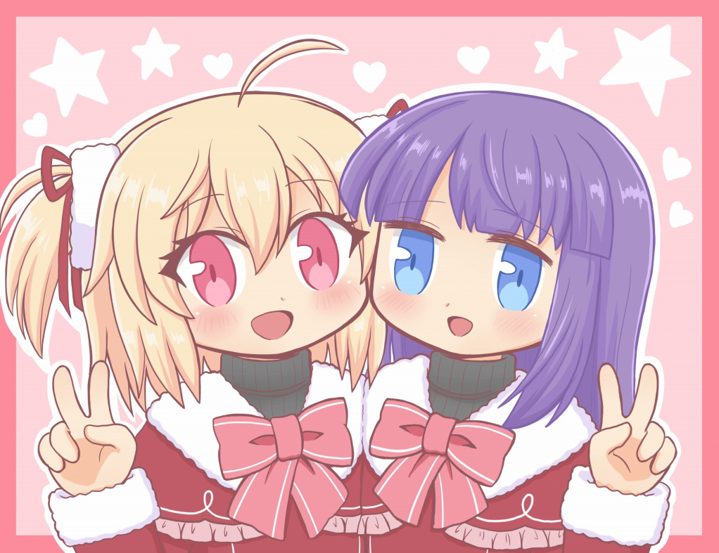 2girls :d ahoge ayano_rika ayano_rika_(cosplay) ayano_rika_(winter_costume) bad_id bad_twitter_id black_sweater blonde_hair blue_eyes blush bow cosplay hair_ribbon heart konoka_(madoka_magica) long_hair long_sleeves looking_at_viewer magia_record:_mahou_shoujo_madoka_magica_gaiden mahou_shoujo_madoka_magica multiple_girls open_mouth pink_background purple_hair red_eyes red_ribbon reverse_(bluefencer) ribbon smile star_(symbol) sweater turtleneck turtleneck_sweater upper_body v