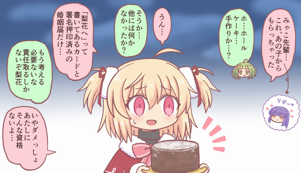 3girls :d ahoge ayano_rika ayano_rika_(winter_costume) bad_food bad_id bad_twitter_id blonde_hair blush bow cake christmas closed_eyes food fur_trim green_eyes green_hair hair_ribbon holding konoka_(madoka_magica) magia_record:_mahou_shoujo_madoka_magica_gaiden mahou_shoujo_madoka_magica miyako_hinano multiple_girls open_mouth pink_eyes purple_hair reverse_(bluefencer) ribbon smile speech_bubble sweater two_side_up