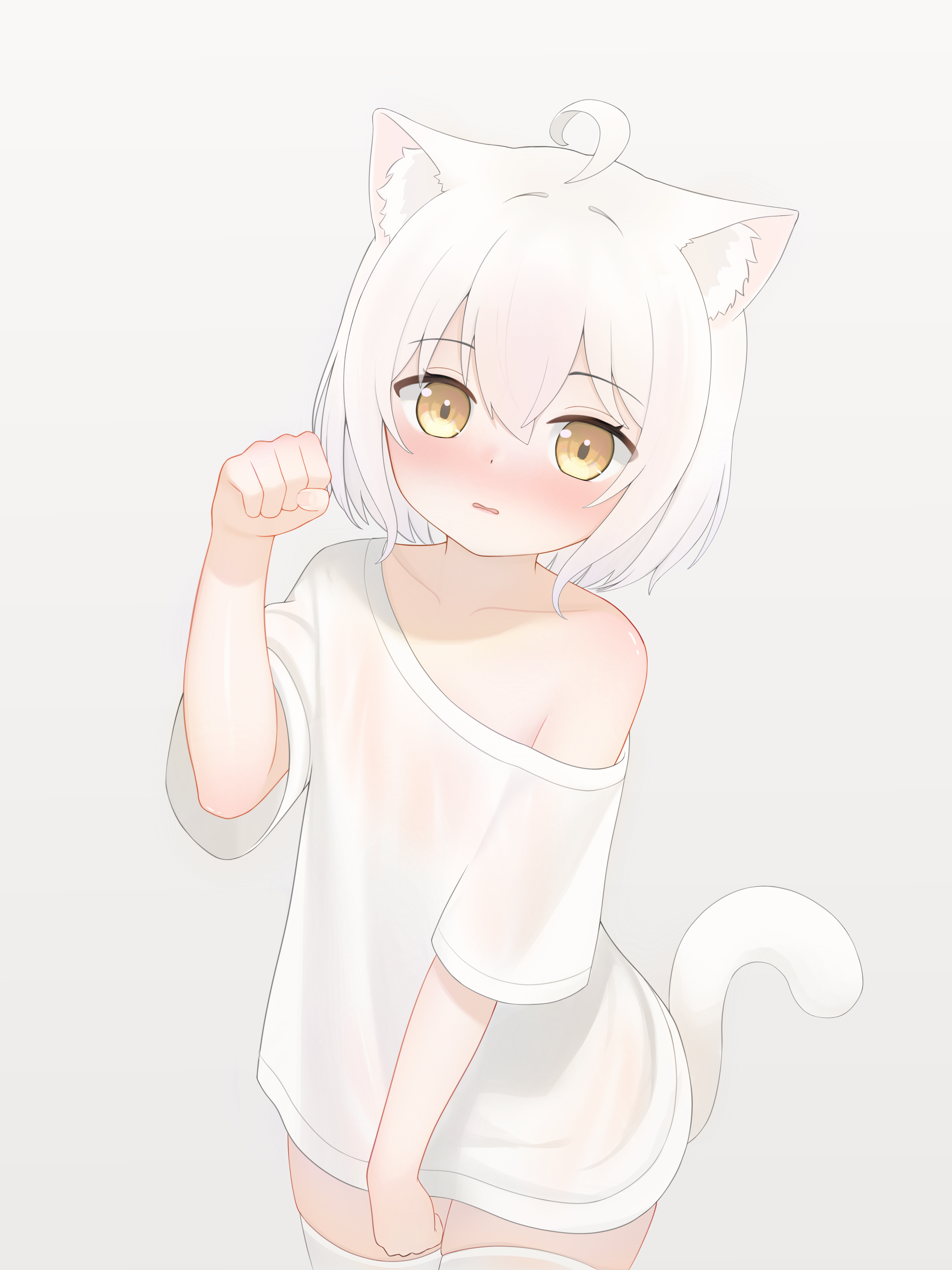 1girl absurdres animal_ears blush cat_ears cat_girl cat_tail embarrassed grey_background highres looking_at_viewer original paw_pose see-through_clothes short_hair short_sleeves simple_background single_bare_shoulder tail thighhighs white_hair white_thighhighs yellow_eyes zhai_mi_xing_hui