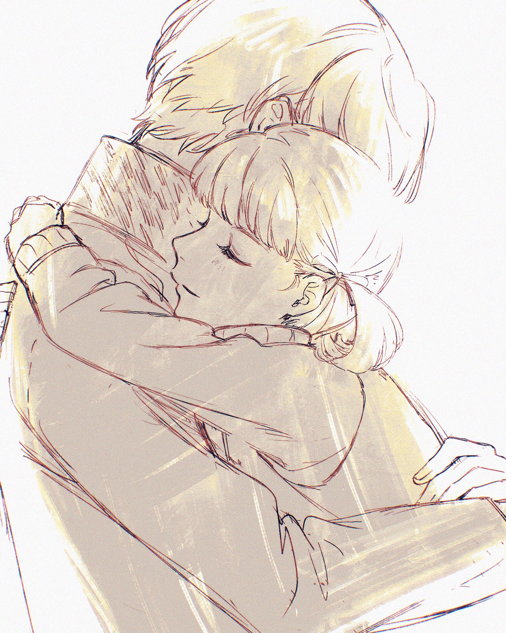 1boy 1girl closed_eyes doujima_nanako highres hug machihazure monochrome narukami_yu persona persona_4 short_hair short_twintails smile sweater twintails upper_body