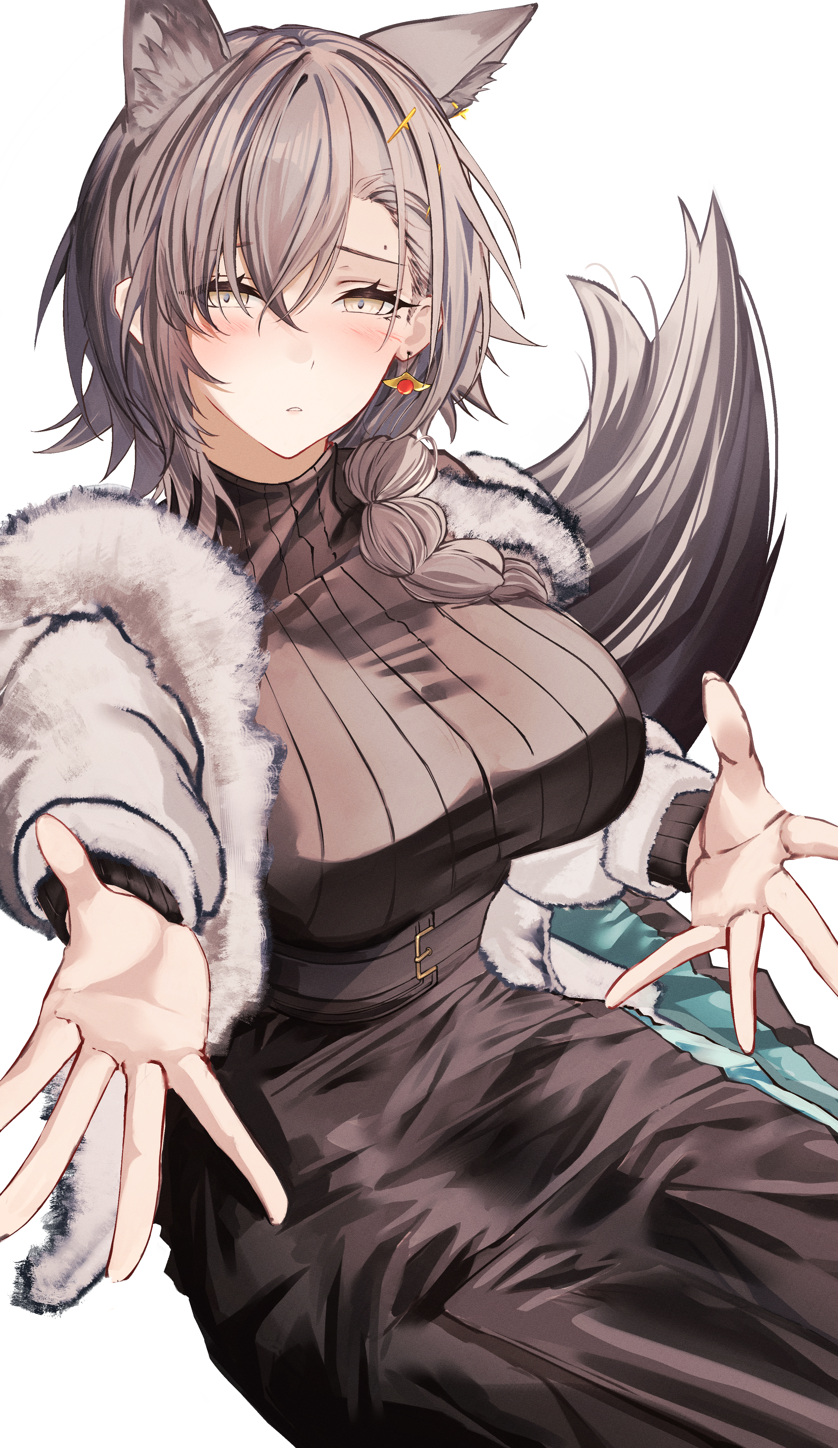 1girl absurdres animal_ear_fluff animal_ears arknights belt belt_buckle black_belt blush braid breasts buckle coat dress earrings extra_ears fur_coat hair_between_eyes highres jacket jewelry large_breasts long_dress long_sleeves looking_at_viewer mo_komo_momo mole mole_above_eye mole_on_forehead official_alternate_costume parted_lips penance_(arknights) penance_(occasionally_flushed)_(arknights) simple_background single_braid solo sweater tail turtleneck turtleneck_sweater white_background white_jacket wolf_ears wolf_girl wolf_tail yellow_eyes