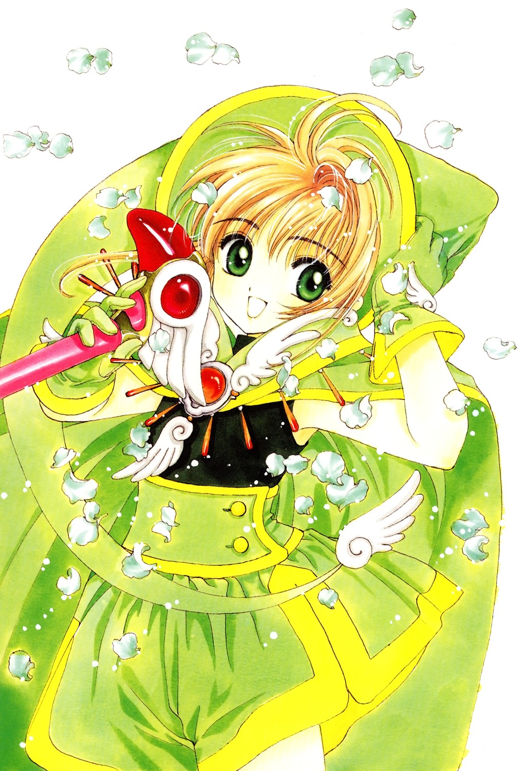 1990s_(style) 1girl :d adjusting_clothes adjusting_headwear antenna_hair black_shirt brooch cape cardcaptor_sakura clamp_(circle) cowboy_shot dot_nose fuuin_no_tsue gloves green_cape green_eyes green_gloves green_hat green_shorts hair_intakes hat highres holding holding_wand jester_cap jewelry kinomoto_sakura looking_at_viewer magical_girl official_alternate_costume official_art open_mouth orange_hair petals retro_artstyle shirt short_hair shorts smile solo standing wand white_background