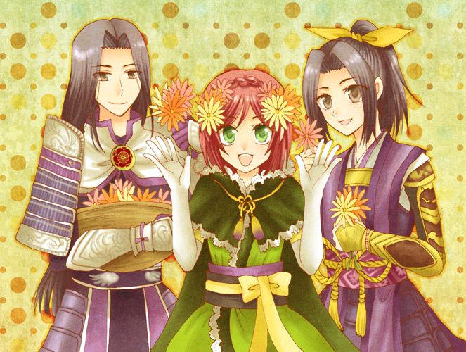 akechi_mitsuhide_(sengoku_musou) armor black_hair braid brown_eyes cape elbow_gloves flower gloves gracia_(sengoku_musou) green_eyes hair_flower hair_ornament hair_ribbon hasuhiko japanese_clothes kimono mori_ranmaru_(sengoku_musou) obi parted_bangs ponytail red_hair ribbon sash sengoku_musou smile topknot