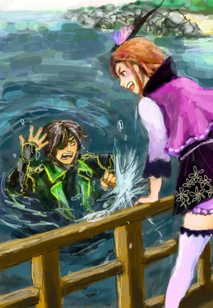 against_railing bridge brown_hair coat date_masamune_(sengoku_musou) eyepatch gracia_(sengoku_musou) green_eyes grimace japanese_clothes kimono leaning_forward railing red_hair sengoku_musou skirt smile splashing thighhighs water