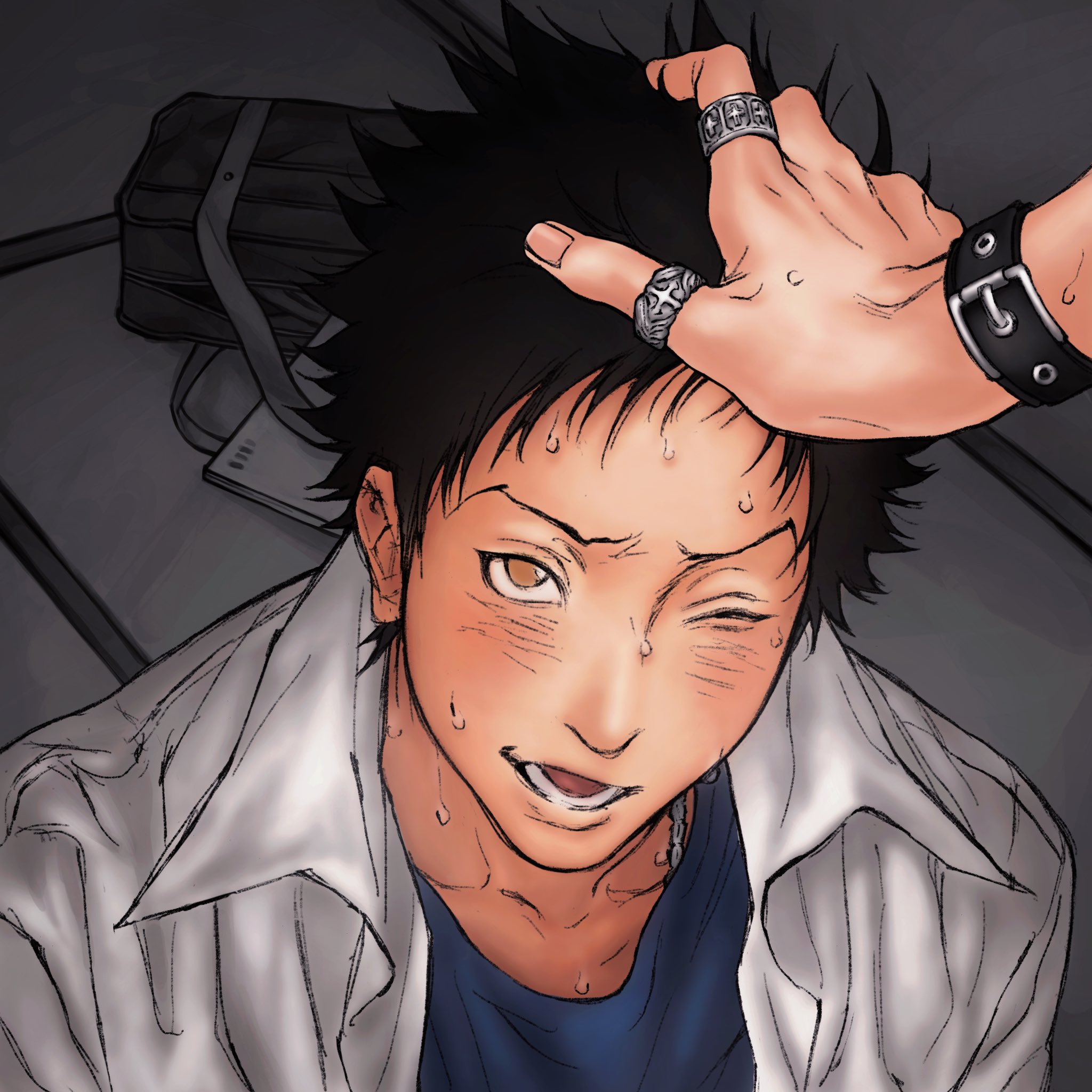 black_hair bracelet brown_eyes hand_on_another's_head highres jewelry katekyo_hitman_reborn! looking_up male_focus one_eye_closed ring shirt short_hair umkaqryi white_shirt yamamoto_takeshi