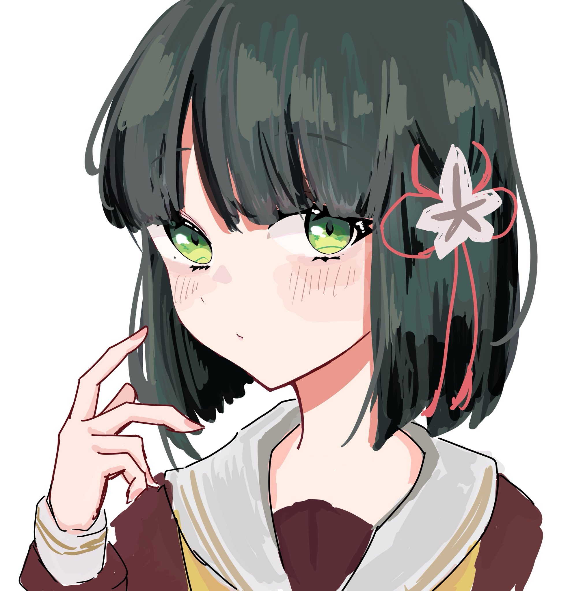 1girl black_hair blunt_bangs blush bob_cut brown_dress closed_mouth commentary dress flower flower_knot green_eyes hair_flower hair_ornament hand_up hashtag-only_commentary hasu_no_sora_school_uniform highres link!_like!_love_live! long_sleeves looking_at_viewer love_live! momose_ginko neckerchief pink_flower rere_88rere sailor_collar sailor_dress school_uniform simple_background solo virtual_youtuber white_background white_sailor_collar winter_uniform yellow_neckerchief