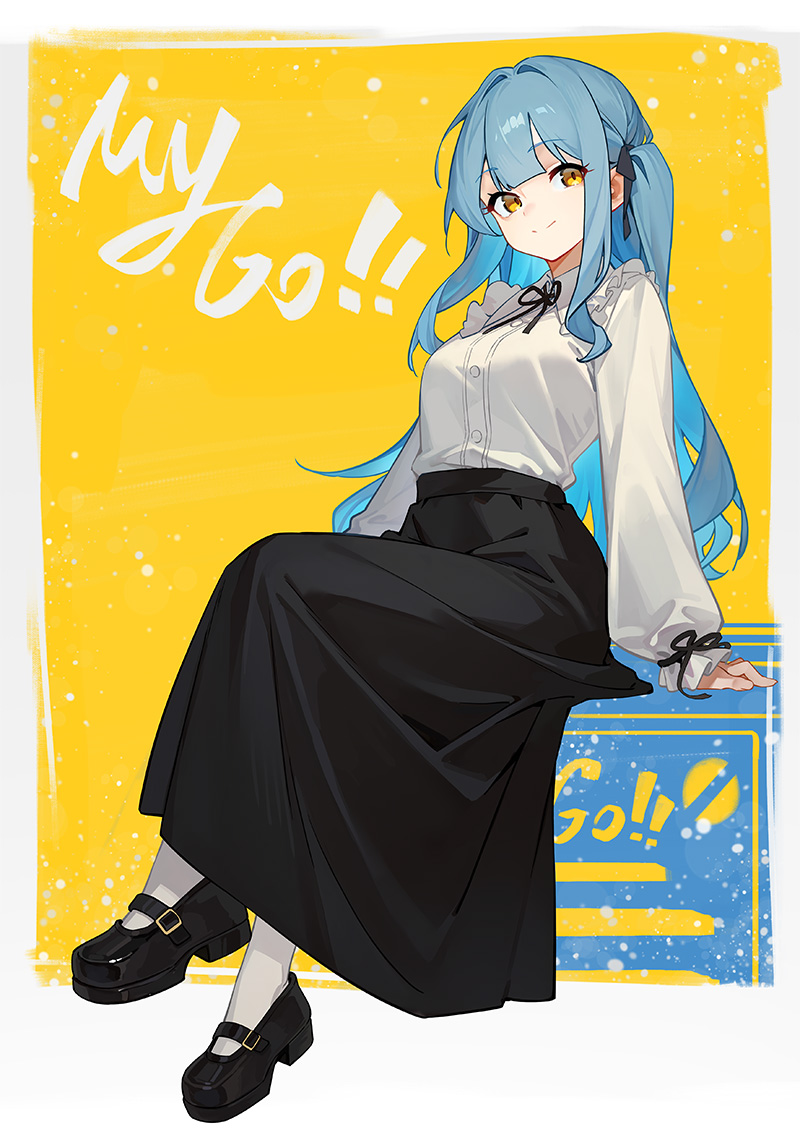1girl azusa_hina bang_dream! bang_dream!_it's_mygo!!!!! black_ribbon black_shoes black_skirt commentary_request dress_shirt hair_ribbon long_hair long_sleeves neck_ribbon ribbon shirt shoes sidelocks skirt socks solo togawa_sakiko white_shirt white_socks yellow_eyes