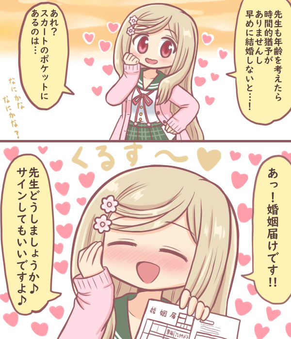 1girl 2koma bad_id bad_twitter_id blonde_hair blush cardigan closed_eyes comic flower green_sailor_collar green_skirt hair_flower hair_ornament hand_on_own_hip heart holding holding_paper kurusu_alexandra long_hair magia_record:_mahou_shoujo_madoka_magica_gaiden mahou_shoujo_madoka_magica marriage_certificate_(object) open_mouth paper pink_cardigan plaid_clothes plaid_skirt red_eyes reverse_(bluefencer) sailor_collar school_uniform serafuku skirt sleeves_past_wrists smile