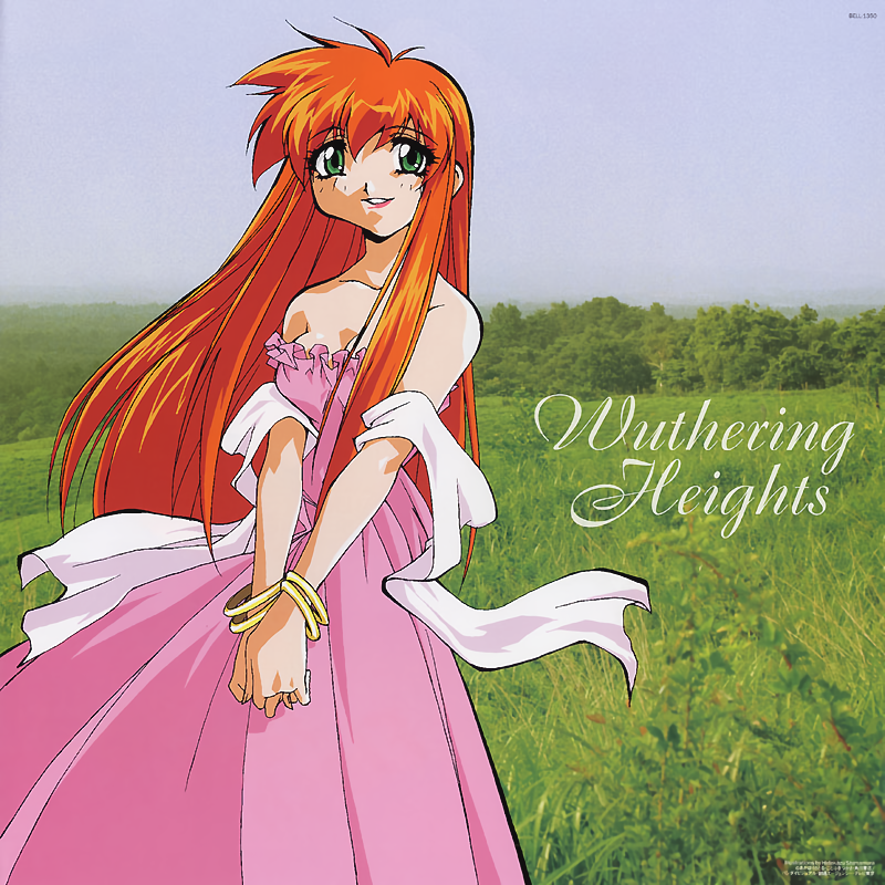 1990s_(style) 1girl bracelet breasts cleavage day dress green_eyes jewelry long_hair lorelei_(saber_j) mixed_media nature non-web_source official_art orange_hair outdoors own_hands_together parted_lips photo_background pink_dress retro_artstyle saber_marionette_j smile solo standing strapless strapless_dress v_arms
