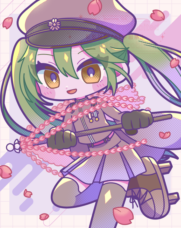 1girl brown_eyes cherry_blossoms chibi green_hair hat hatsune_miku holding long_hair looking_at_viewer medal military_hat military_uniform open_mouth satome_(min) senbonzakura senbonzakura_(vocaloid) skirt smile solo thighhighs twintails very_long_hair vocaloid