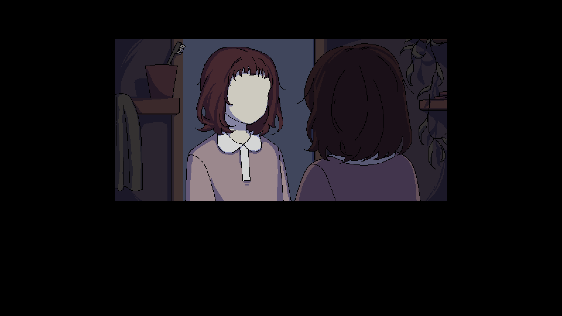 1girl brown_hair different_reflection faceless faceless_female game_cg ghost_funeral highres looking_at_mirror medium_hair milk-chan_(milk_series) milk_inside_a_bag_of_milk_inside_a_bag_of_milk mirror non-web_source official_art pixel_art reflection spoilers toothbrush variant_set
