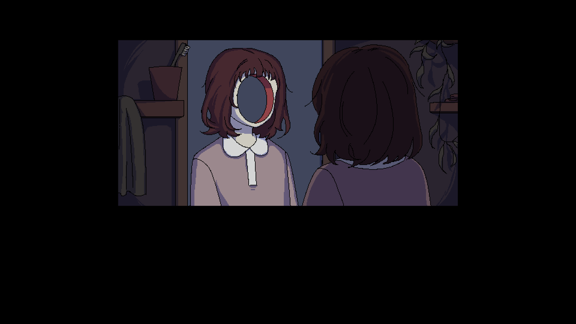 1girl body_horror brown_hair different_reflection game_cg ghost_funeral highres hole_in_face horror_(theme) looking_at_mirror medium_hair milk-chan_(milk_series) milk_inside_a_bag_of_milk_inside_a_bag_of_milk mirror non-web_source official_art pixel_art reflection spoilers toothbrush variant_set