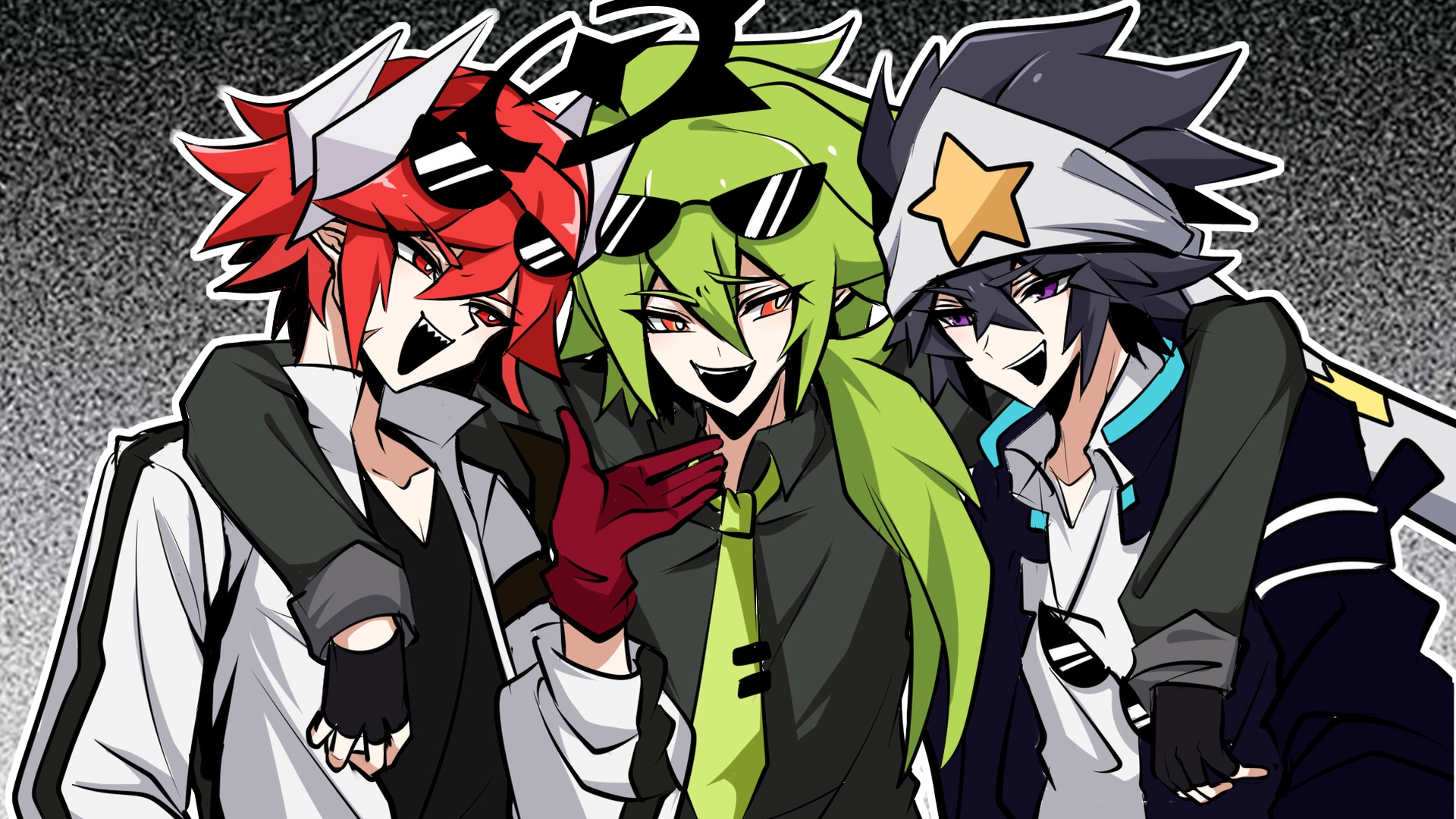 1210534020 3boys aotu_world arm_around_shoulder bandana black_gloves black_hair black_jacket black_shirt chinese_commentary collared_shirt eyewear_on_head fangs fingerless_gloves gloves green_hair green_necktie hair_between_eyes halo hand_up hat headband headgear high_collar highres jacket long_hair long_sleeves looking_at_another looking_at_viewer low_ponytail male_focus multiple_boys necktie official_alternate_costume open_clothes open_jacket open_mouth pius_(aotu_world) pointy_ears ponytail purple_eyes ray_(aotu_world) ray_(campus)_(aotu_world) red_eyes red_gloves red_hair scar scar_on_face sharp_teeth shirt short_hair smile star_(symbol) star_print sunglasses teeth unworn_headwear upper_body v-neck white_headband white_jacket white_shirt xander_(aotu_world) xander_(campus)_(aotu_world)