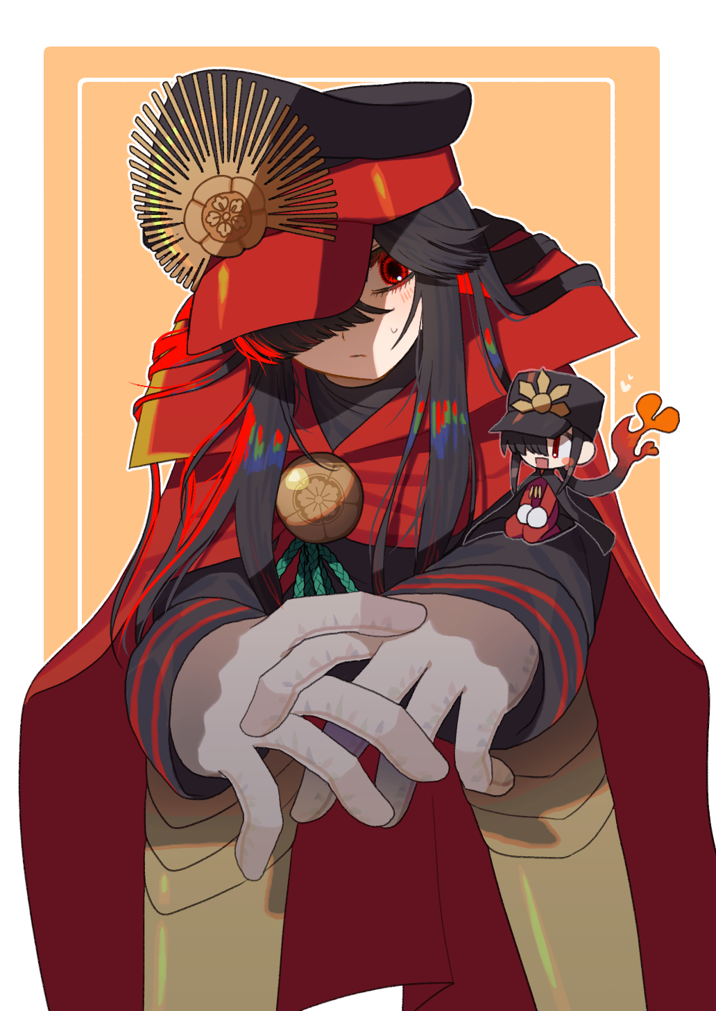 1girl black_cape black_hair black_hat blush brother_and_sister cape chibi crest family_crest fate/grand_order fate_(series) fiery_hair gloves hair_over_one_eye hat highres jacket kmot_ybsg long_hair long_sleeves low_ponytail military_hat oda_nobukatsu_(fate) oda_nobunaga_(fate) oda_nobunaga_(koha-ace) oda_uri pants peaked_cap ponytail red_cape red_eyes red_hat red_pants siblings sidelocks sitting two-tone_background two-tone_hat white_background white_gloves yellow_background
