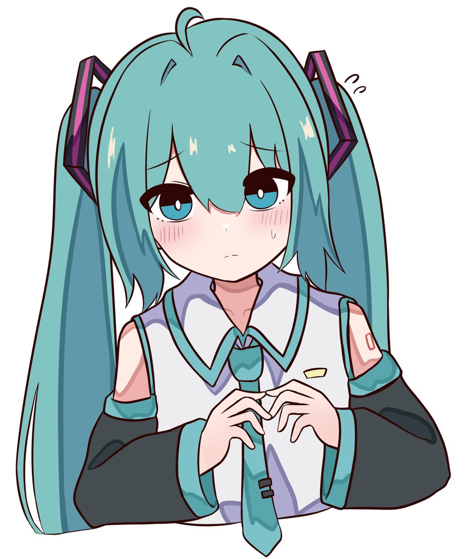 1girl aqua_eyes aqua_hair blue_eyes blue_hair closed_mouth collared_shirt detached_sleeves hair_ornament hatsune_miku long_hair looking_at_viewer necktie nervous rirurima25 shirt simple_background solo twintails very_long_hair vocaloid white_background