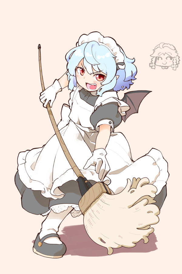 2girls ^_^ alternate_costume apron bat_wings berusuke_(beru_no_su) black_dress black_shoes blue_hair brown_background closed_eyes dress enmaided fang full_body gloves hair_between_eyes holding holding_mop izayoi_sakuya looking_at_viewer maid maid_apron maid_headdress mary_janes mop multiple_girls open_mouth pointy_ears puffy_short_sleeves puffy_sleeves red_hair remilia_scarlet shoes short_hair short_sleeves socks touhou v-shaped_eyebrows white_apron white_gloves white_socks wings