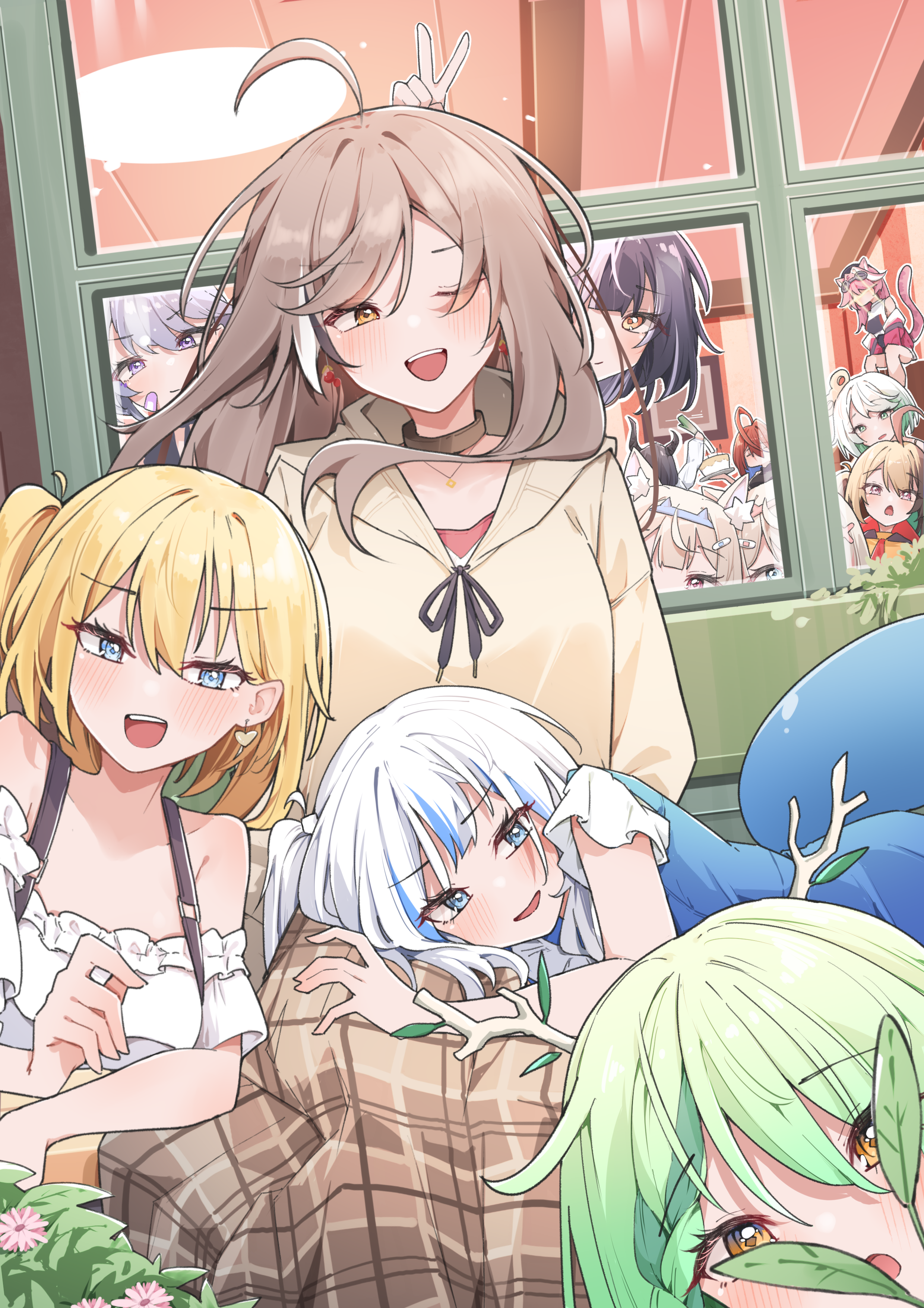 +_+ 6+girls absurdres ahoge airenif black_choker black_hair blonde_hair blue_eyes blue_hair blush brown_eyes brown_hair brown_hoodie brown_skirt cecilia_immergreen ceres_fauna character_request choker commentary drawstring earrings elizabeth_rose_bloodflame fins fish_tail floating_hair food-themed_earrings fuwawa_abyssgard gawr_gura gigi_murin green_hair heart heart_earrings highres holoadvent holojustice hololive hololive_english hood hood_down hoodie indoors jewelry koseki_bijou lap_pillow long_hair long_skirt long_sleeves looking_at_viewer mococo_abyssgard multicolored_hair multiple_girls nanashi_mumei nanashi_mumei_(casual) nerissa_ravencroft official_alternate_costume one_eye_closed one_side_up open_mouth outdoors pink_hair plaid_clothes plaid_skirt raora_panthera shark_girl shark_tail shiori_novella shirt sitting skirt smile streaked_hair tail v v_over_head virtual_youtuber watson_amelia white_hair window yellow_eyes
