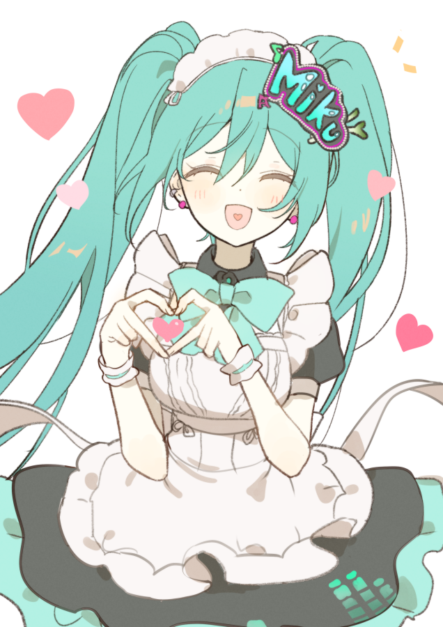 1girl alternate_costume apron breasts character_name closed_mouth hatsune_miku heart heart_hands heart_in_mouth long_hair maid maid_apron maid_day maid_headdress open_mouth smile solo twintails very_long_hair vocaloid wohinya