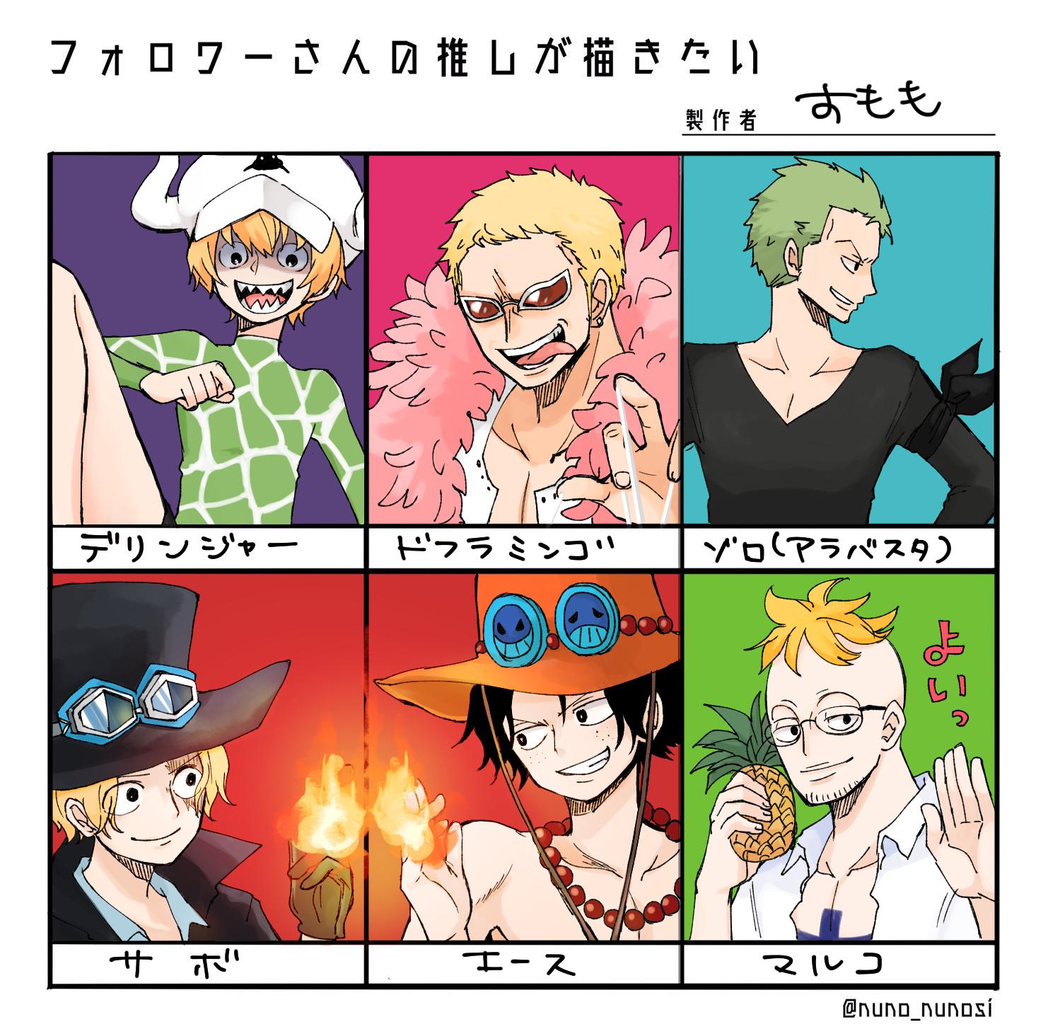6+boys bandana_around_arm blonde_hair brothers cape chest_tattoo commentary_request dellinger_(one_piece) donquixote_doflamingo feather_cape fire glasses hat highres jewelry marco_(one_piece) multiple_boys necklace one_piece orange_hat pearl_necklace pink_cape portgas_d._ace roronoa_zoro sabo_(one_piece) scar scar_on_face sharp_teeth short_hair siblings sumomo_(momoringo56) sunglasses tattoo teeth tongue tongue_out topless_male twitter_username v-shaped_eyebrows