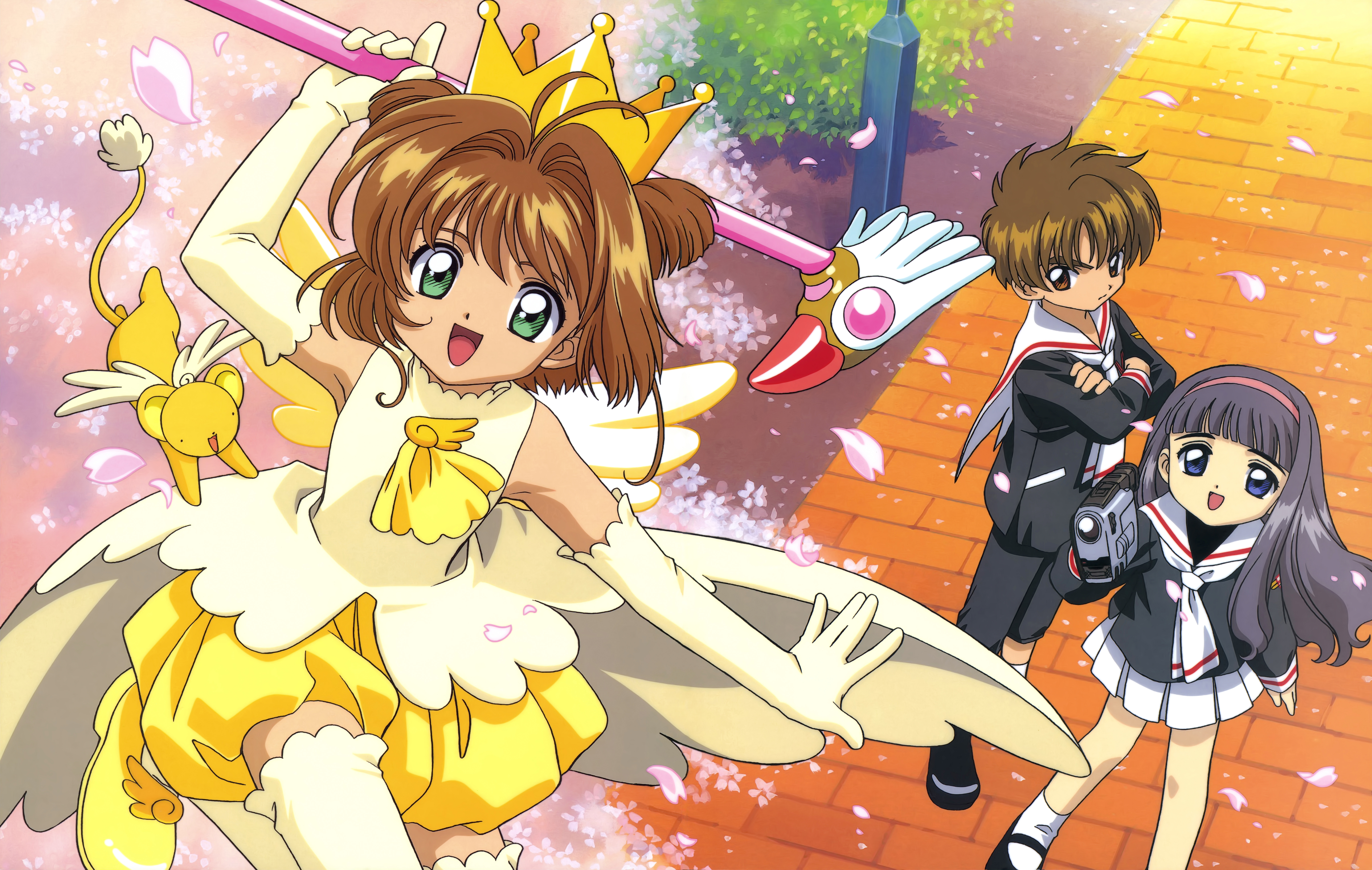 1990s_(style) 1boy 2girls :d absurdres antenna_hair black_hair black_pants black_shirt black_shoes blue_eyes brick_road brown_eyes brown_hair bubble_skirt camcorder camera cardcaptor_sakura cherry_blossoms closed_mouth creature crossed_arms crown daidouji_tomoyo dot_nose elbow_gloves fujita_mariko fuuin_no_tsue gloves gold_crown green_eyes hair_intakes hairband highres holding holding_camera holding_wand kero_(cardcaptor_sakura) kinomoto_sakura kinomoto_sakura_(miraculous_sakura) li_syaoran long_hair looking_at_another looking_at_viewer magical_girl multiple_girls official_art open_mouth outdoors pants petals pink_hairband pink_petals pleated_skirt pointed_crown retro_artstyle sailor_collar scan school_uniform shirt shoes short_hair skirt sleeveless sleeveless_shirt smile socks standing thighhighs tomoeda_elementary_school_uniform tomoeda_middle_school_uniform two_side_up video_camera wand white_gloves white_sailor_collar white_skirt white_socks white_thighhighs yellow_shoes yellow_skirt